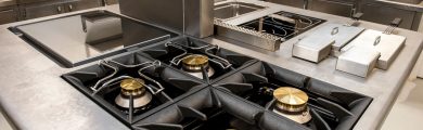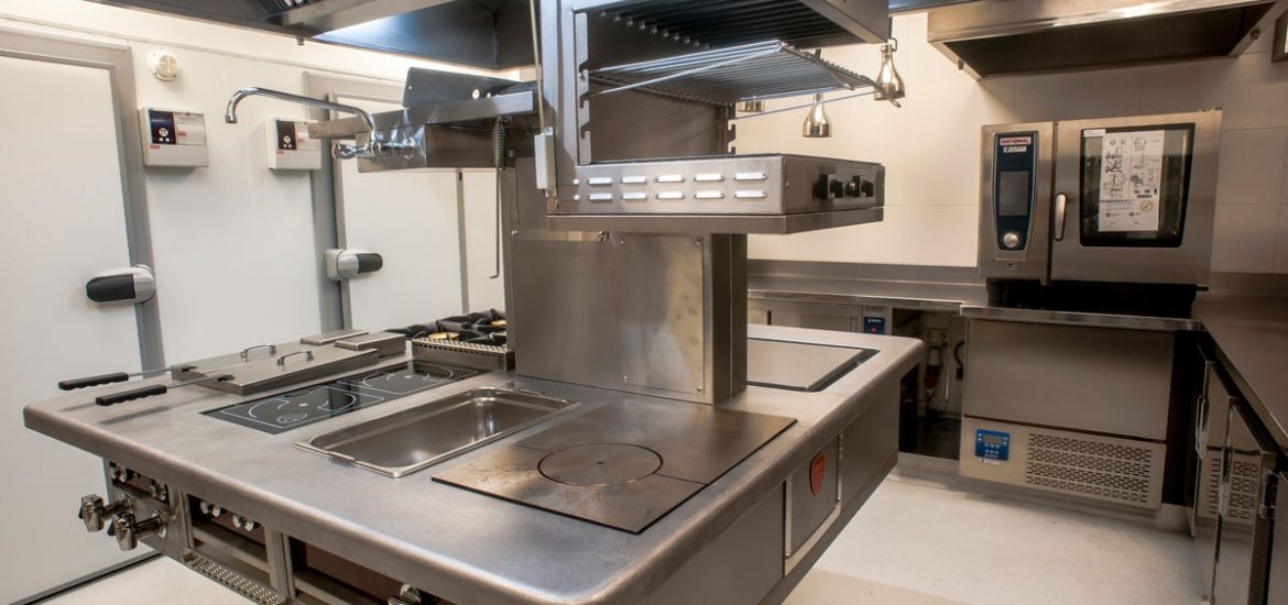 Installation dans ce restaurant d’auteur d’un module de cuisine sur mesure Charvet sur bâti en maçonnerie, meubles en acier inoxydable avec un système d’extraction complet et installation frigorifique avec moteur à distance.