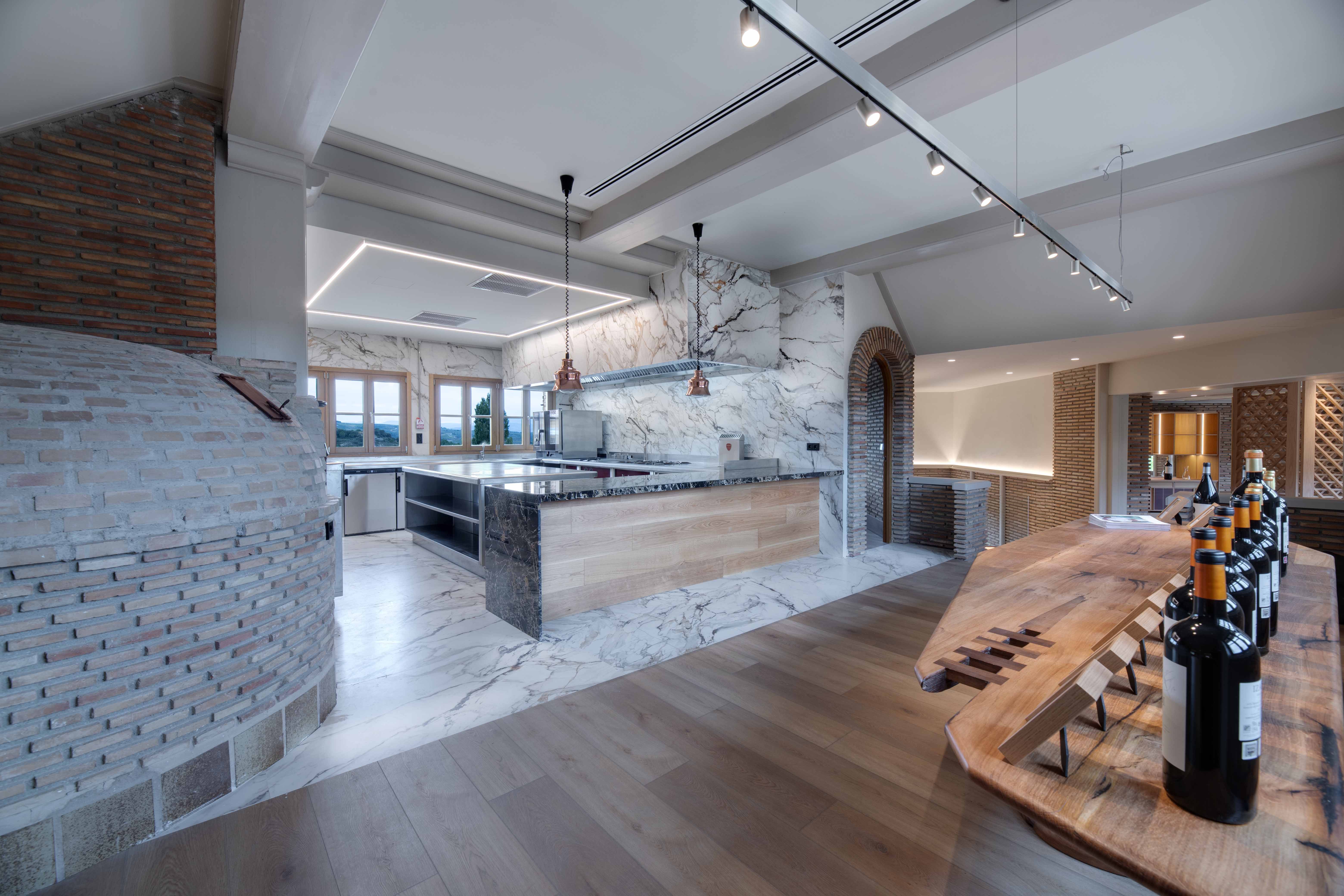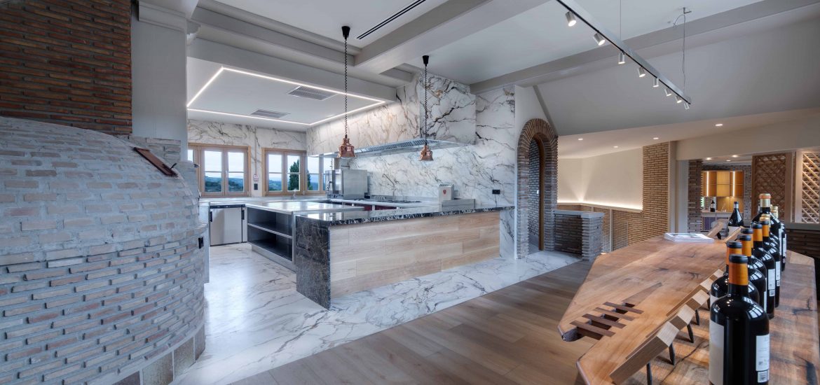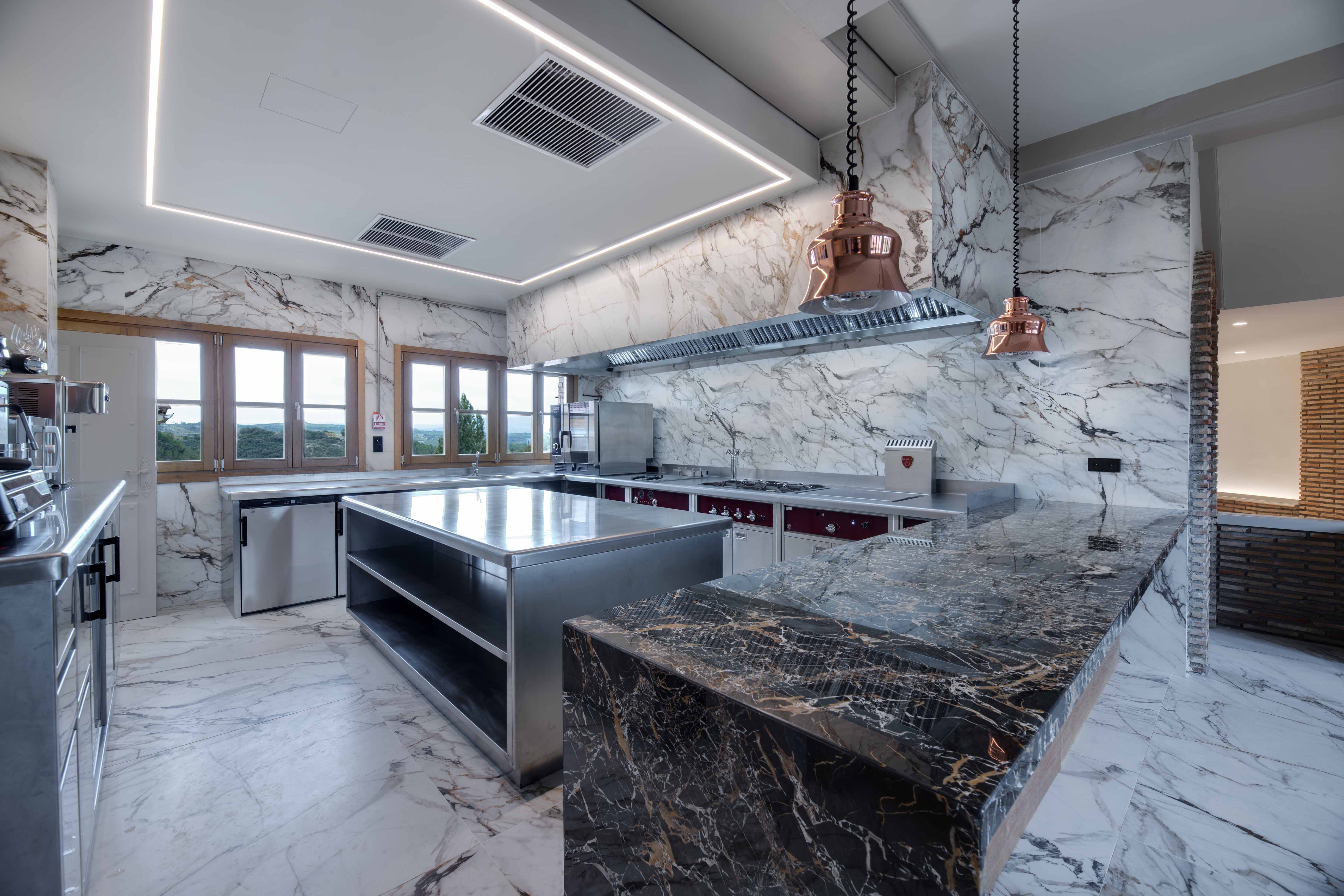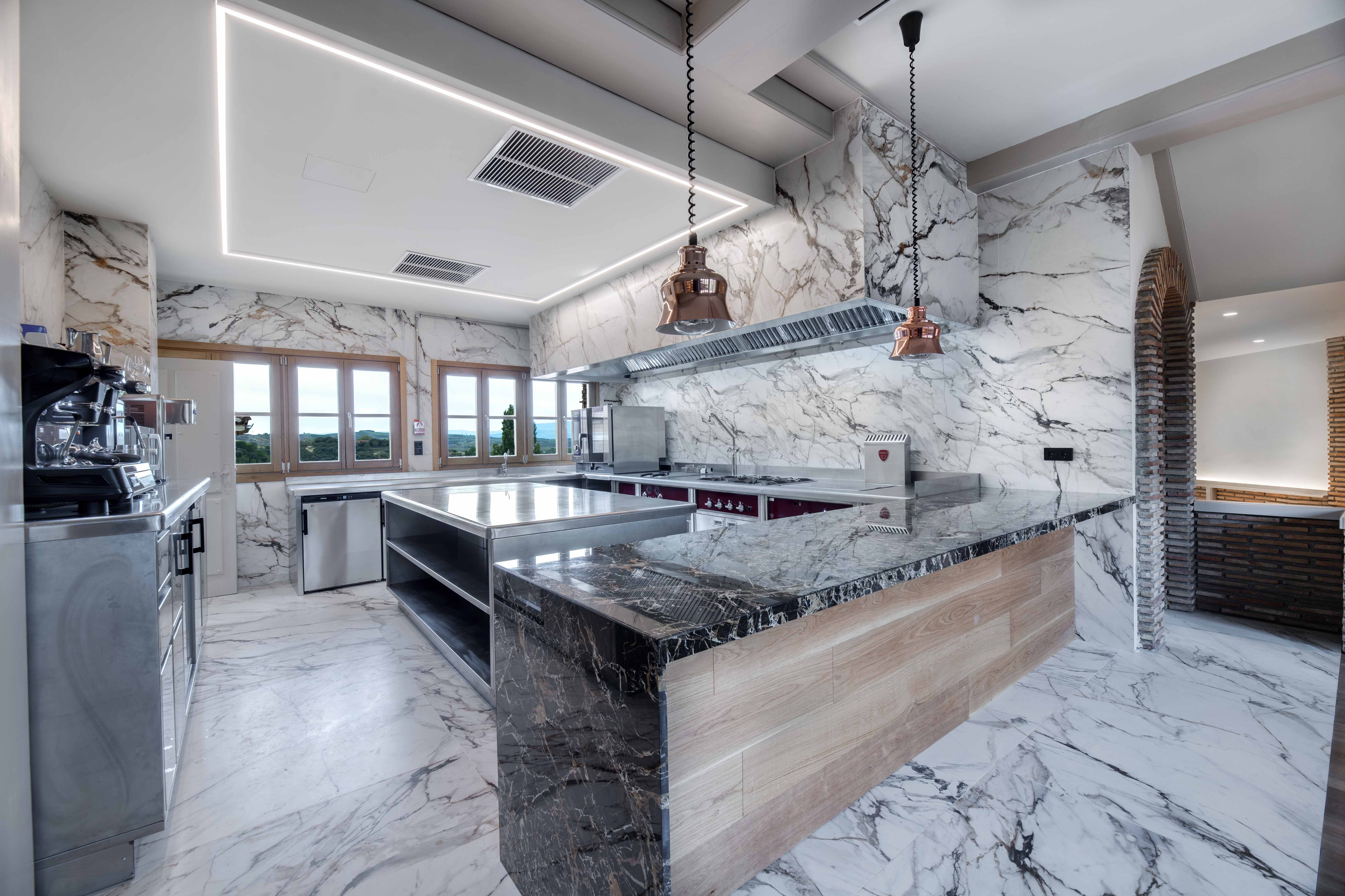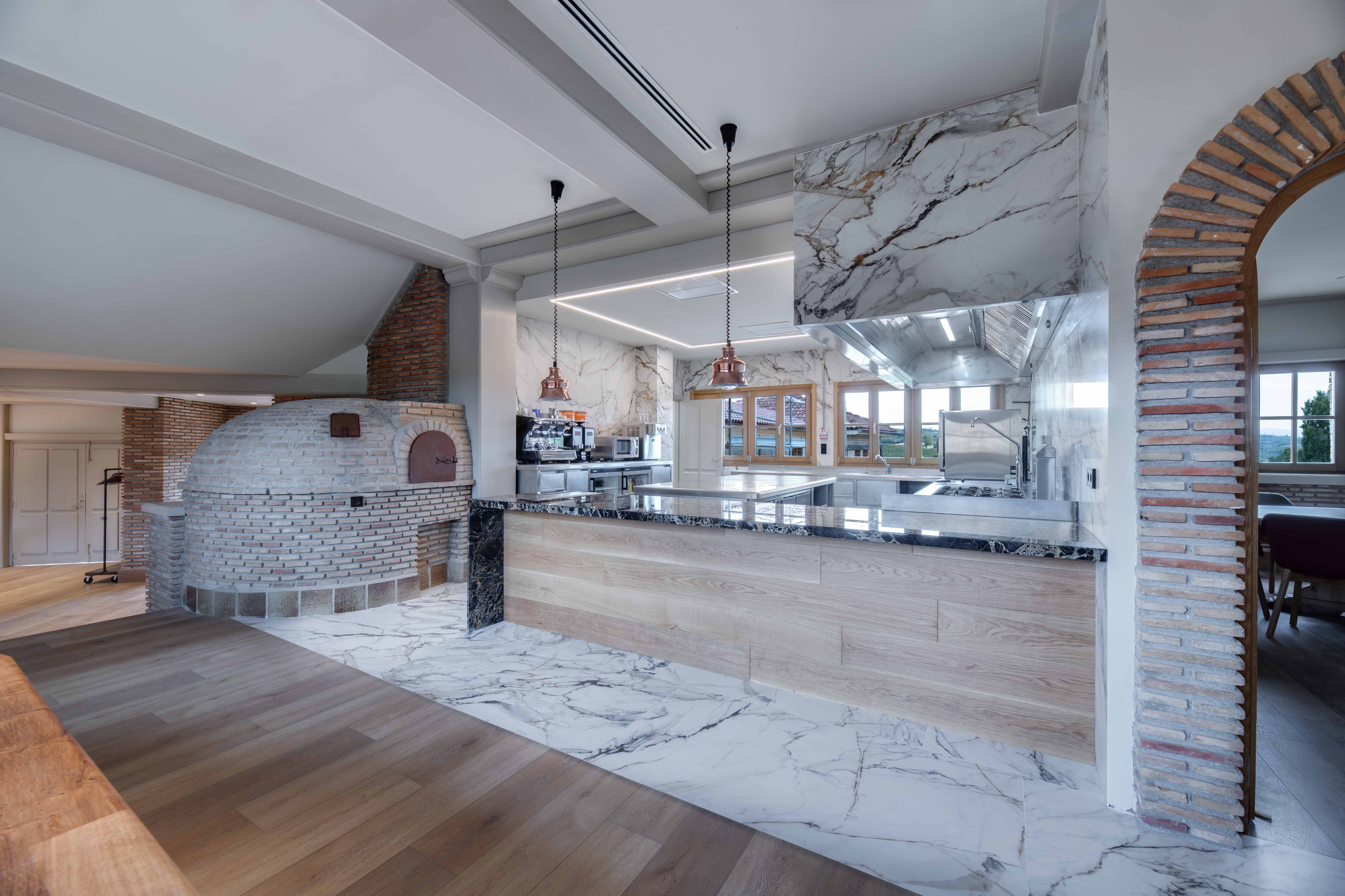 La cocina de la Bodega Izadi ha sido diseñada pensando en sus clientes y distribuidores, ofreciendo un espacio alineado con la calidad y la estética de la bodega. Totalmente abierta, esta cocina se integra en el entorno con elegancia, con paredes y suelo revestidos de Neolith y un frontal de campana que se presenta como un bloque cohesivo y visualmente impactante.
