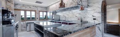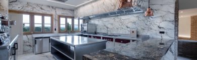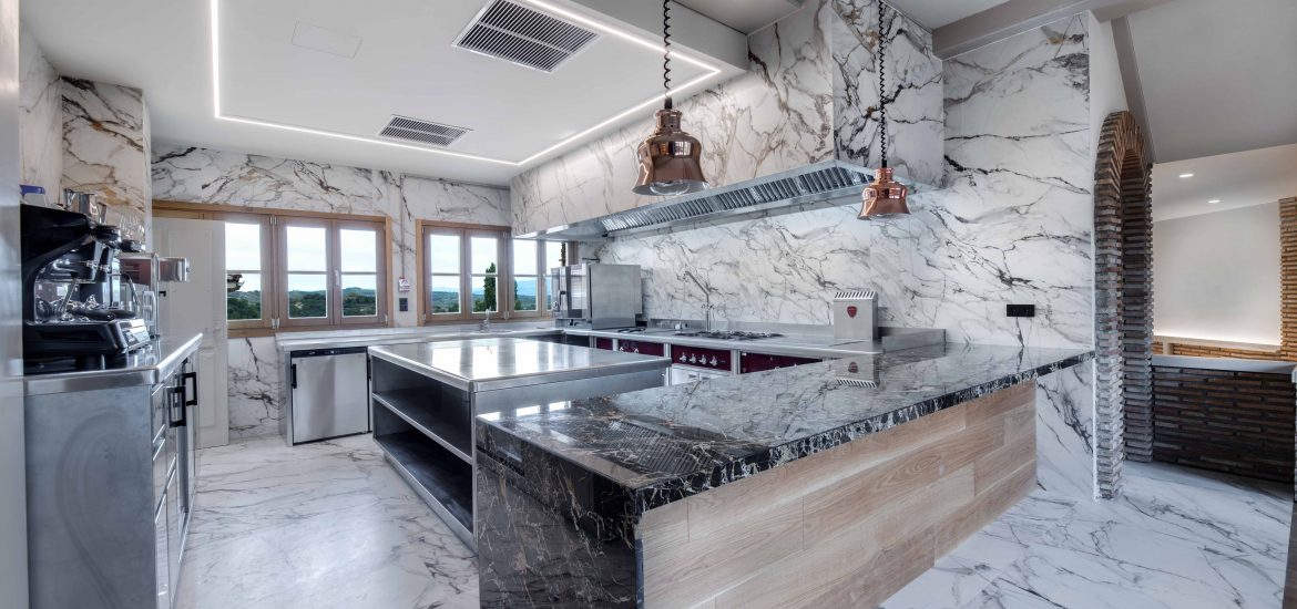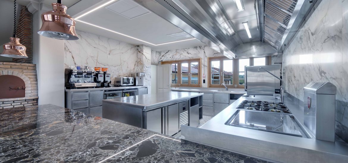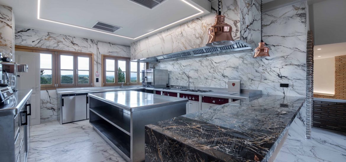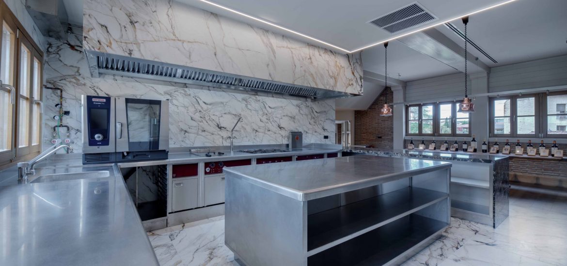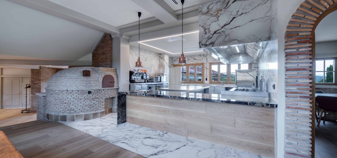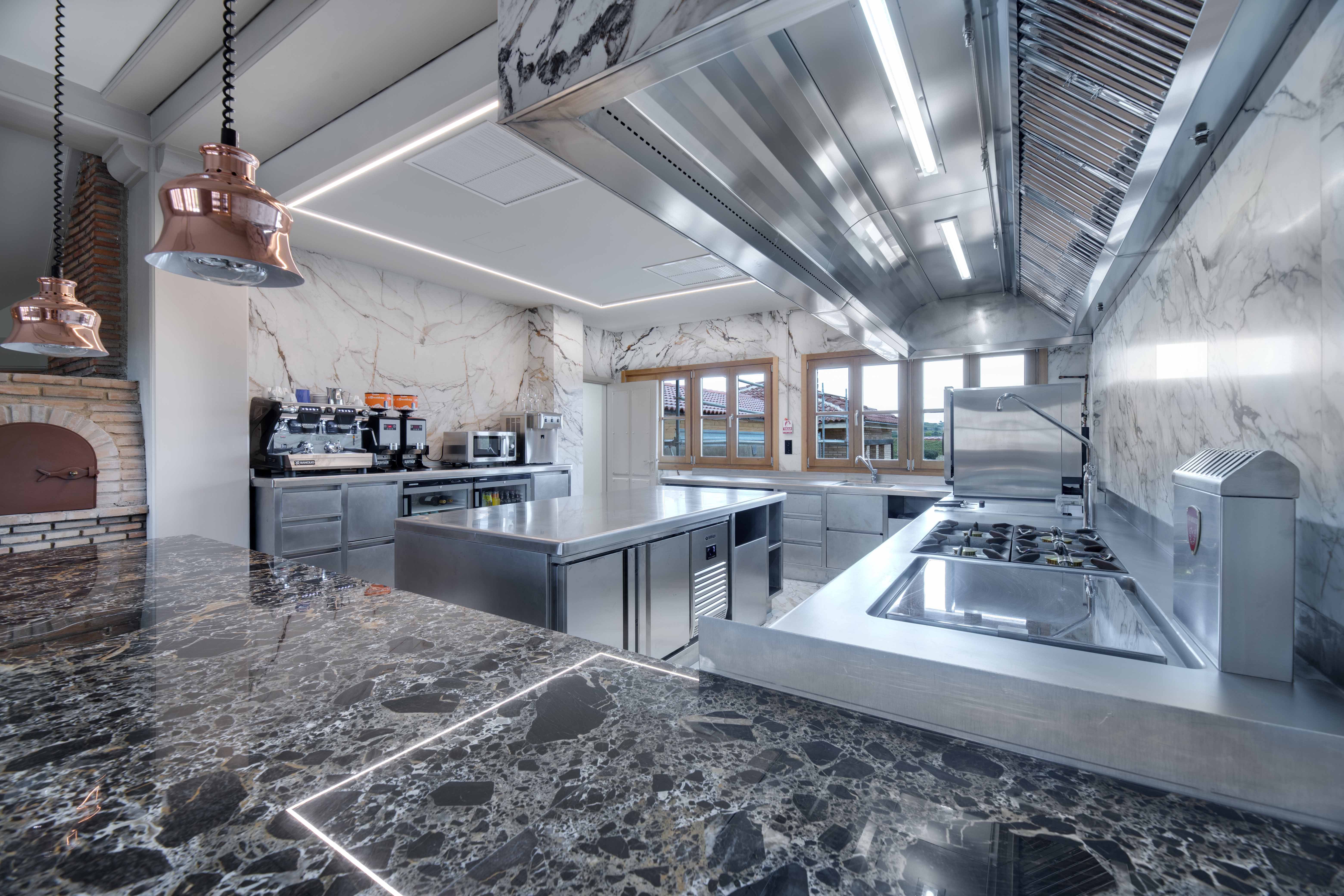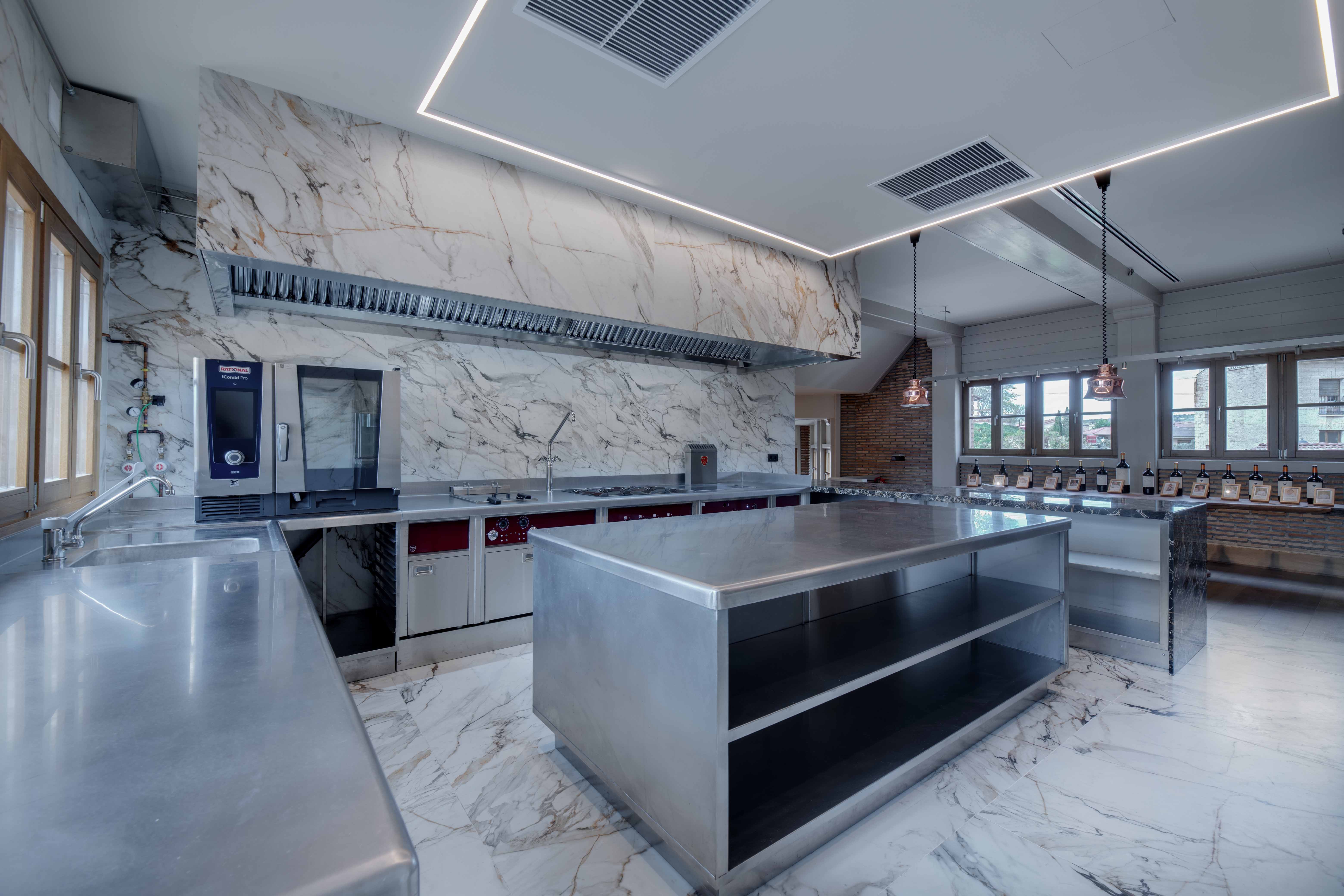 La cocina de la Bodega Izadi ha sido diseñada pensando en sus clientes y distribuidores, ofreciendo un espacio alineado con la calidad y la estética de la bodega. Totalmente abierta, esta cocina se integra en el entorno con elegancia, con paredes y suelo revestidos de Neolith y un frontal de campana que se presenta como un bloque cohesivo y visualmente impactante.