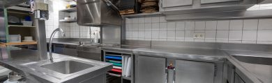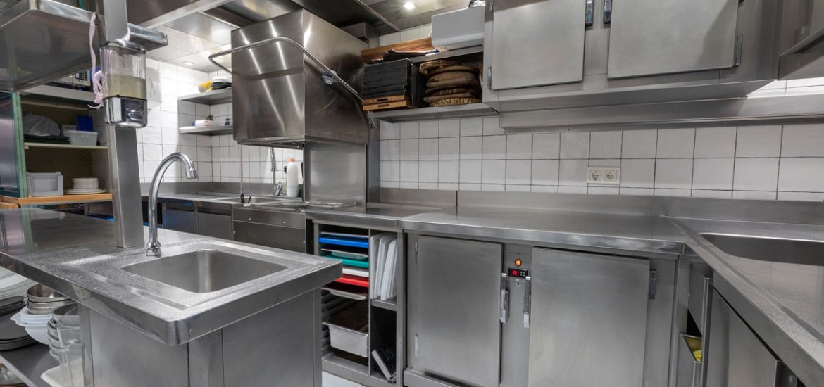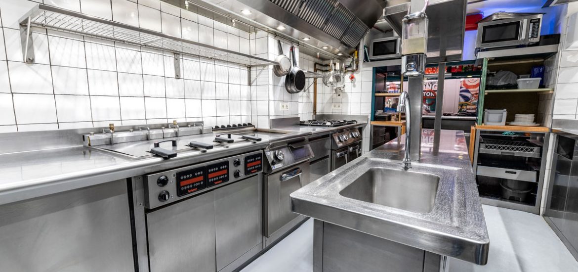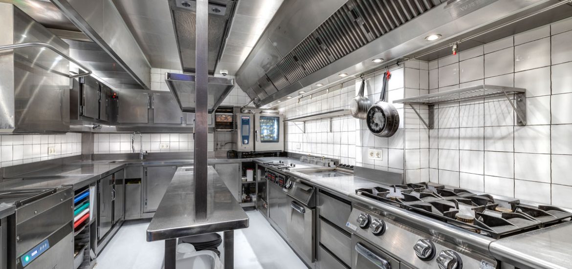 Instalación de una cocina completa de alta producción en un espacio muy reducido con mobiliario de acero inox a medida acompañado de techo filtrante e instalación de frío.