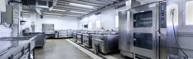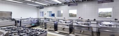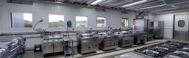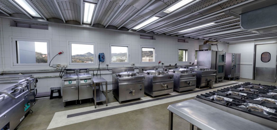 Instalación de un bloque de cocina de inox de gran dimensión y robustez compuesto por hornos, marmitas, sartenes y techo filtrante que cuenta con el acompañamiento constante durante toda la vida útil de la instalación.