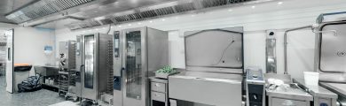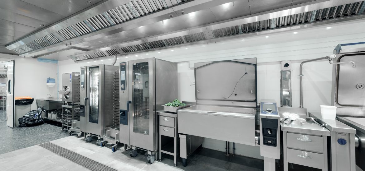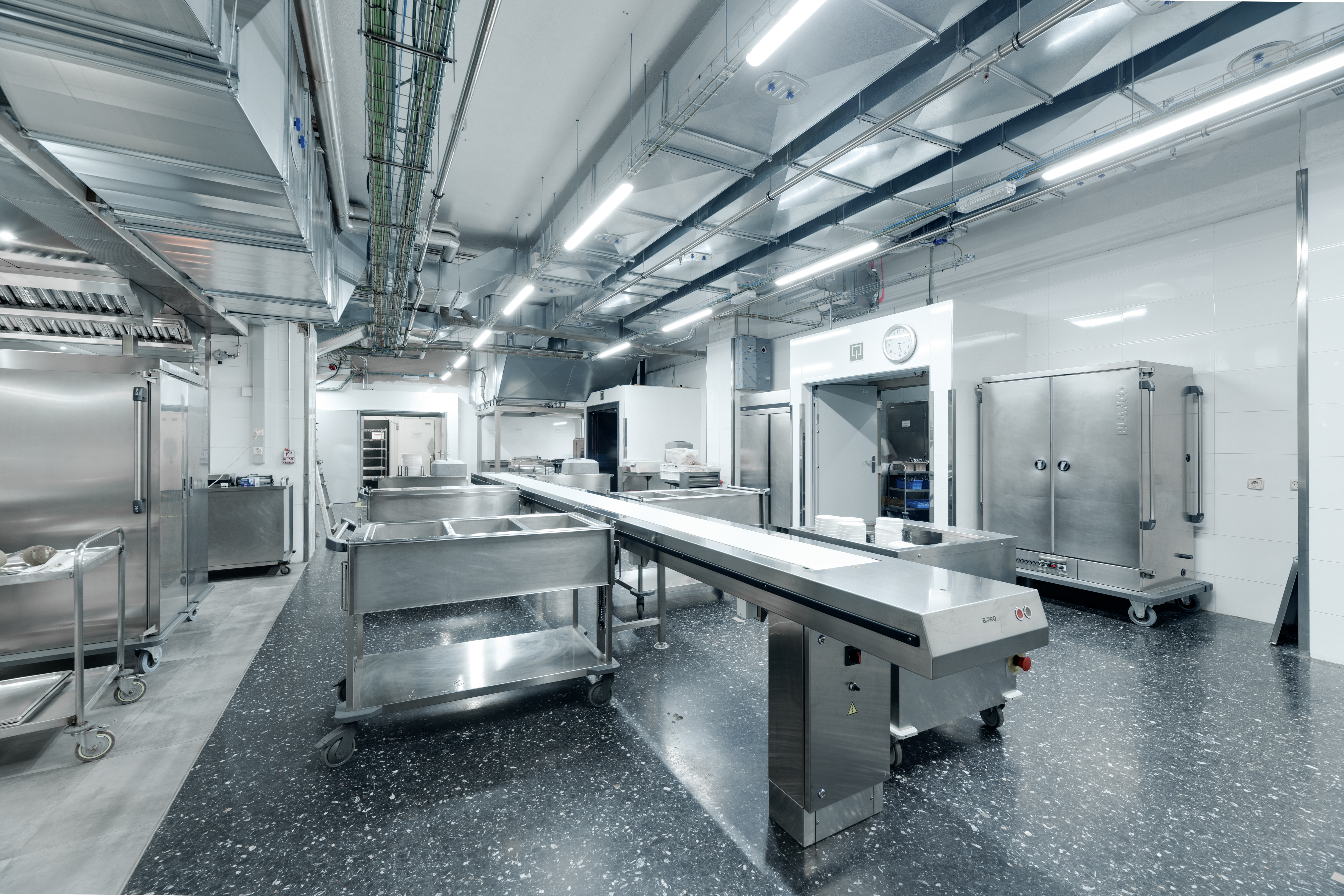 En la zona de gran producción se han instalado hornos Rational e iVario de 150L y 25+25, a parte de un cocedor de vapor de Bonnet. Se ha instalado una zona de emplatado con una cinta y carros dispensadores de platos y baños maría de Blanco.