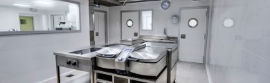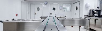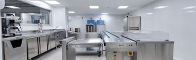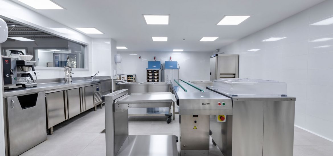 Se completa con techo filtrante Vianen autolimpiante y zonas de cámaras con equipos partidos a distancia, zona de preparación con temperatura controlada, de basuras, de plonge, de cocción, cocina de dietas, zona de emplatado, de montaje en carros para distribución y áreas de lavado con túnel.