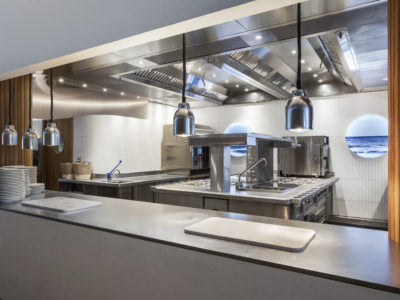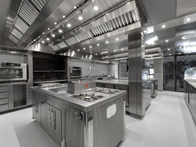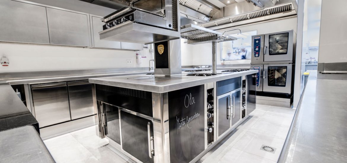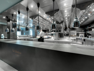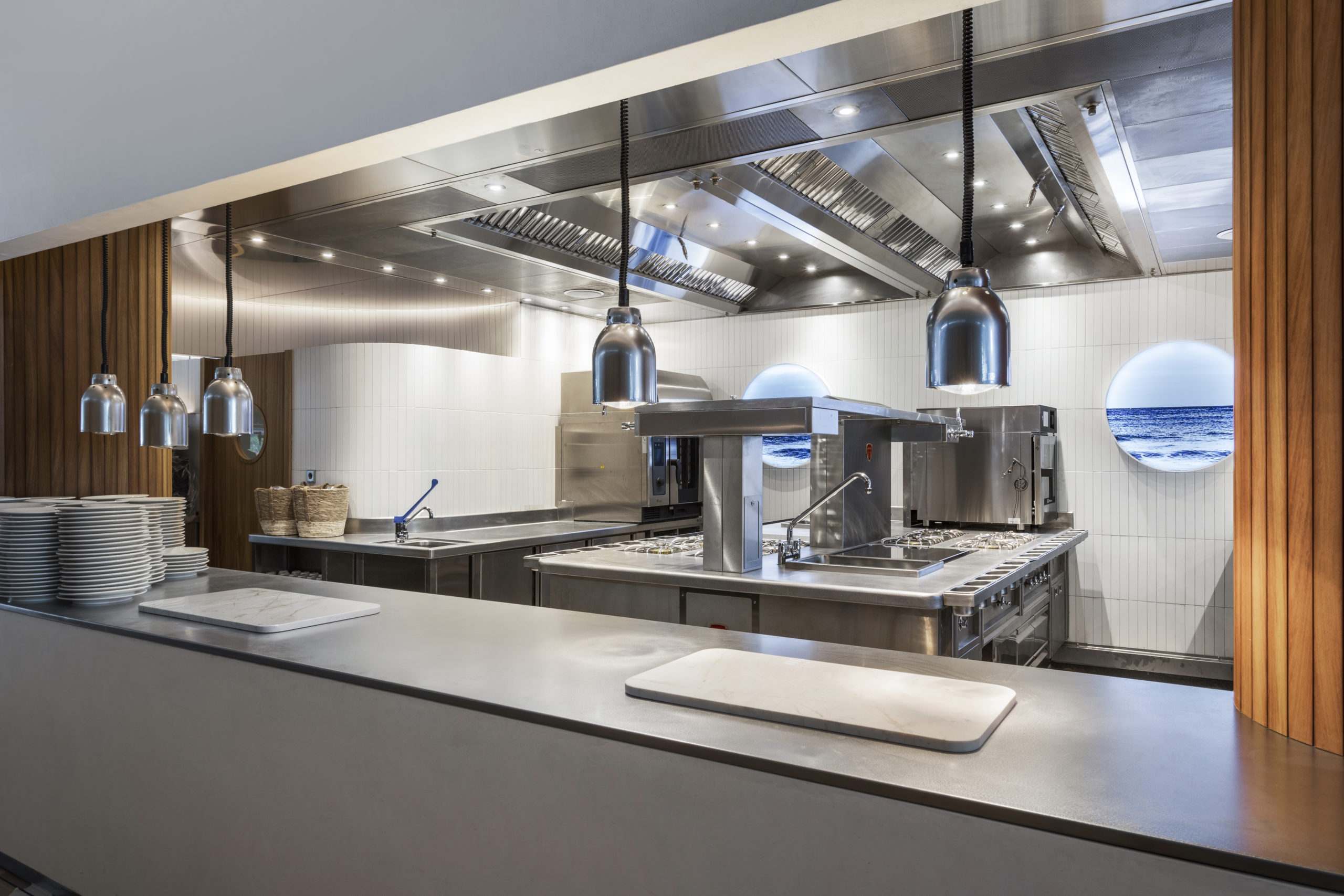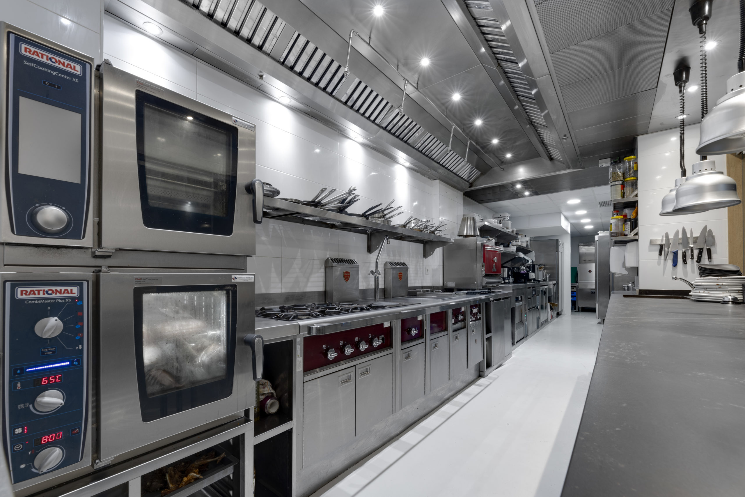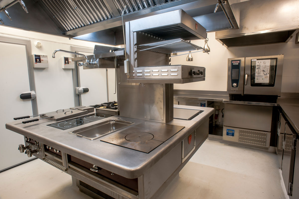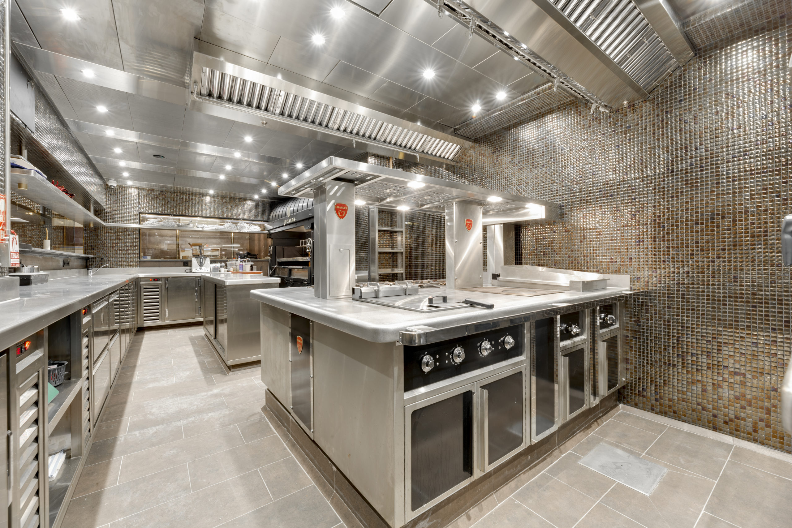 Una segunda cocina central Charvet de plano único y techo filtrante para restaurante de autor con cuarto frio de preparación y zona con túnel de lavado.