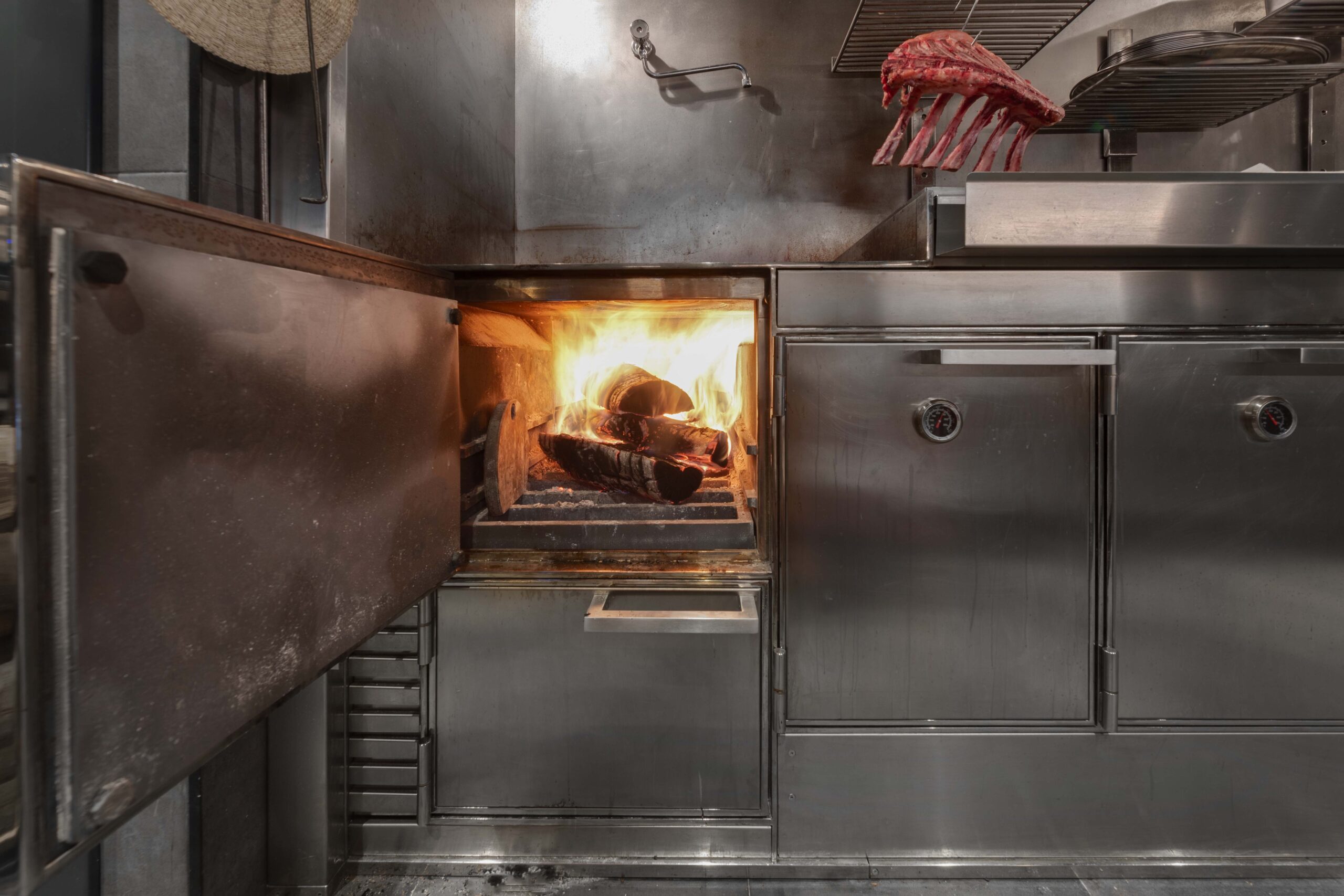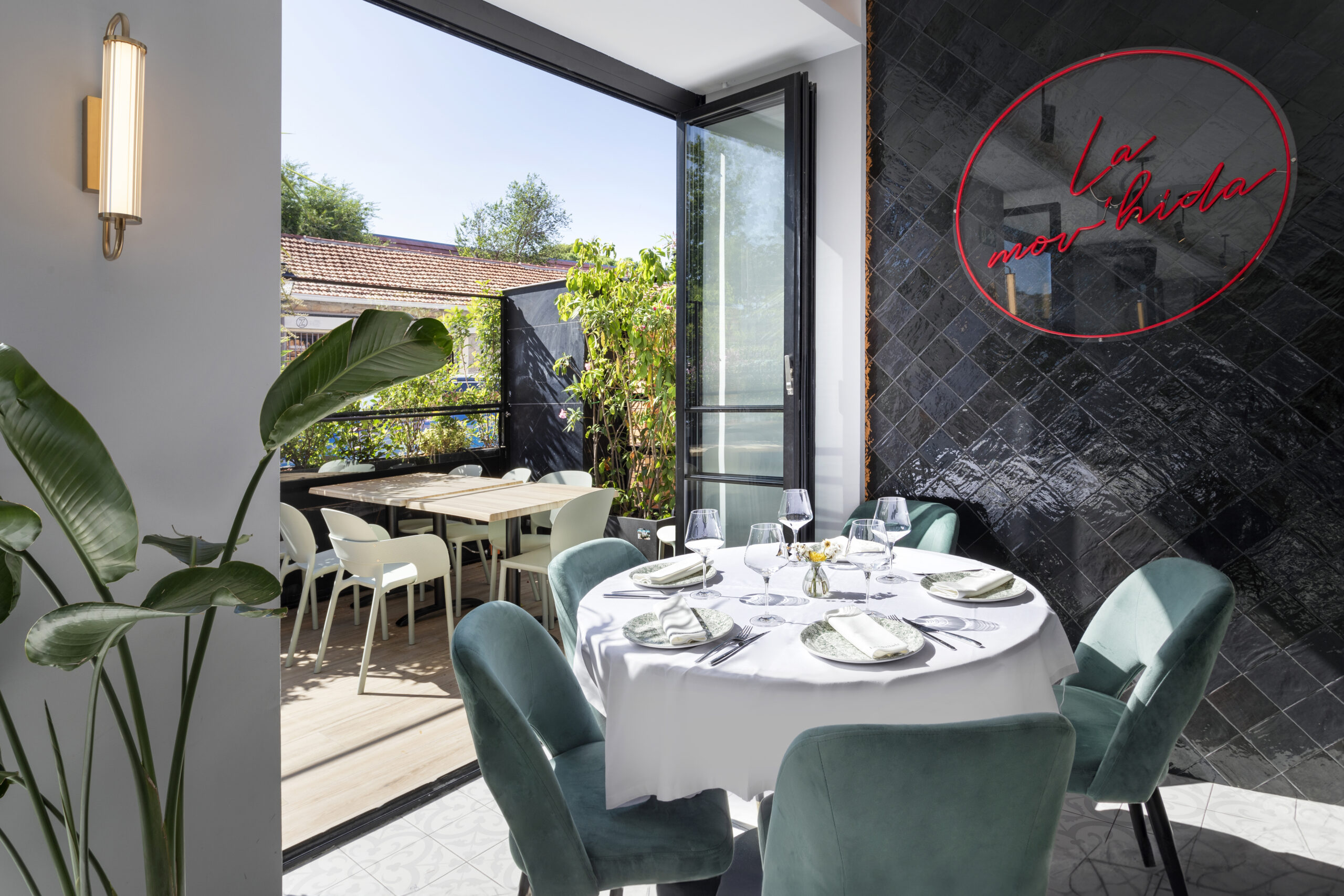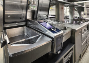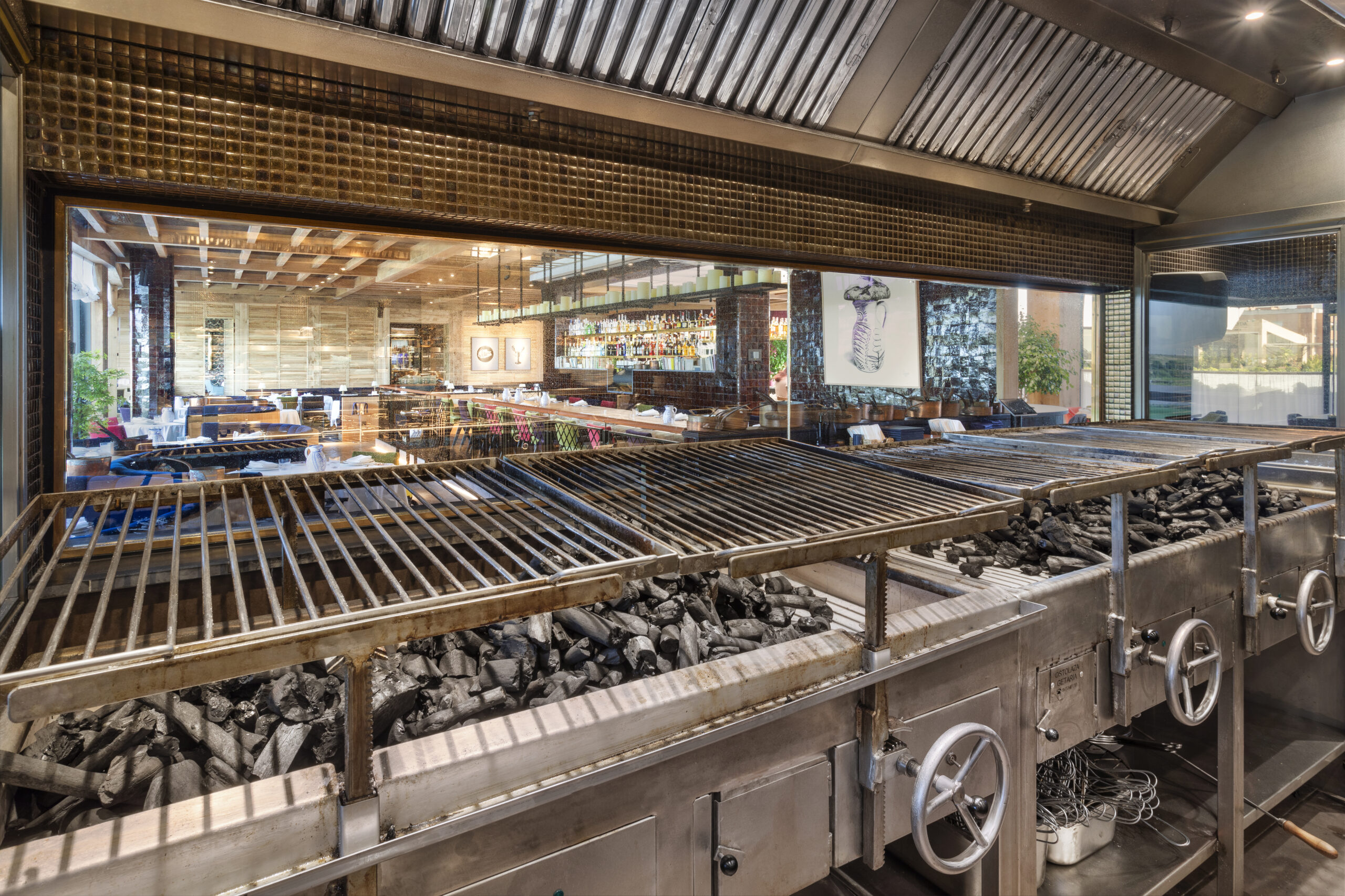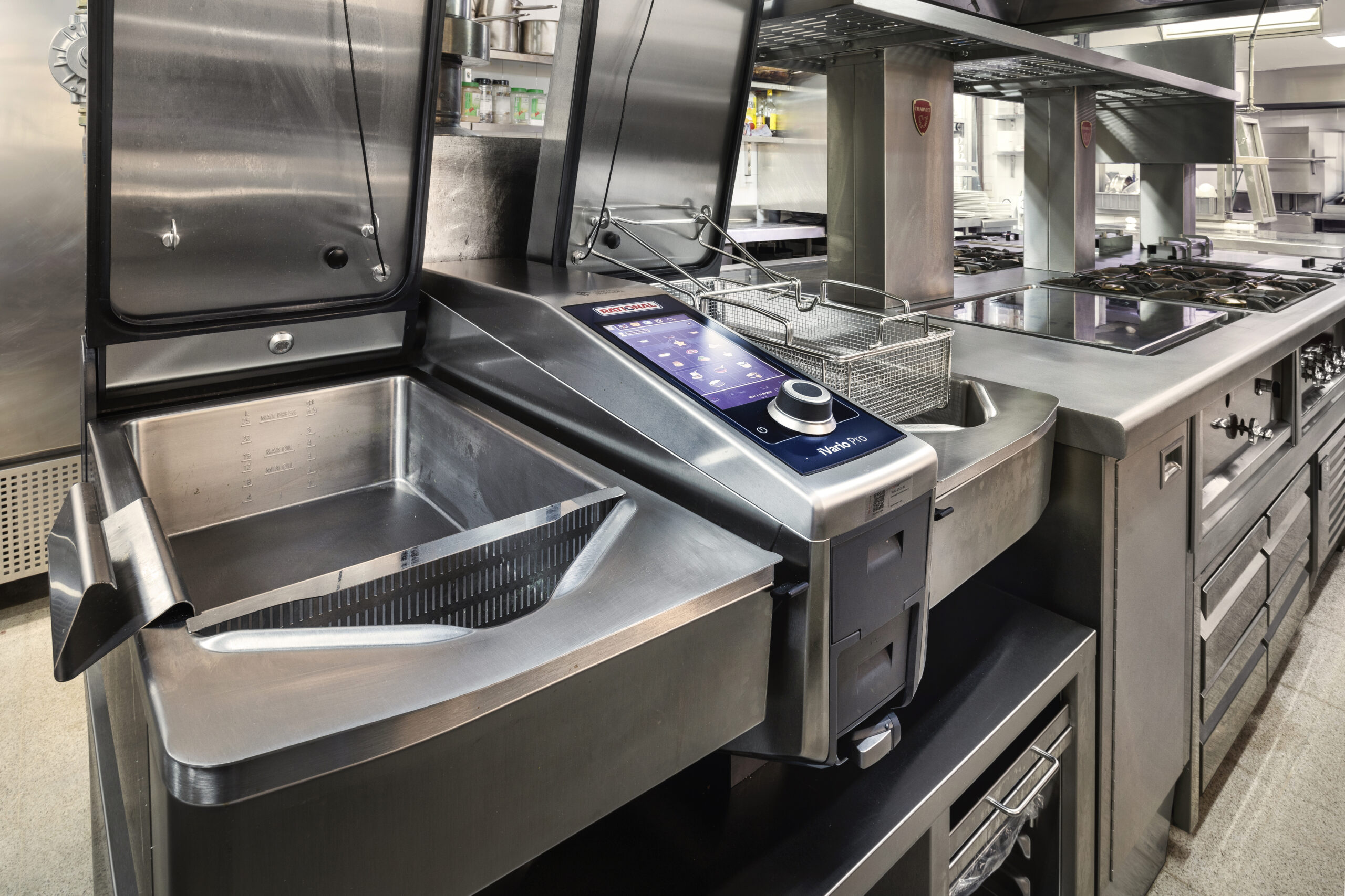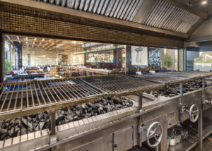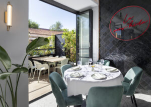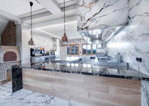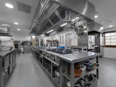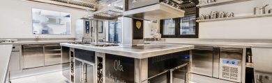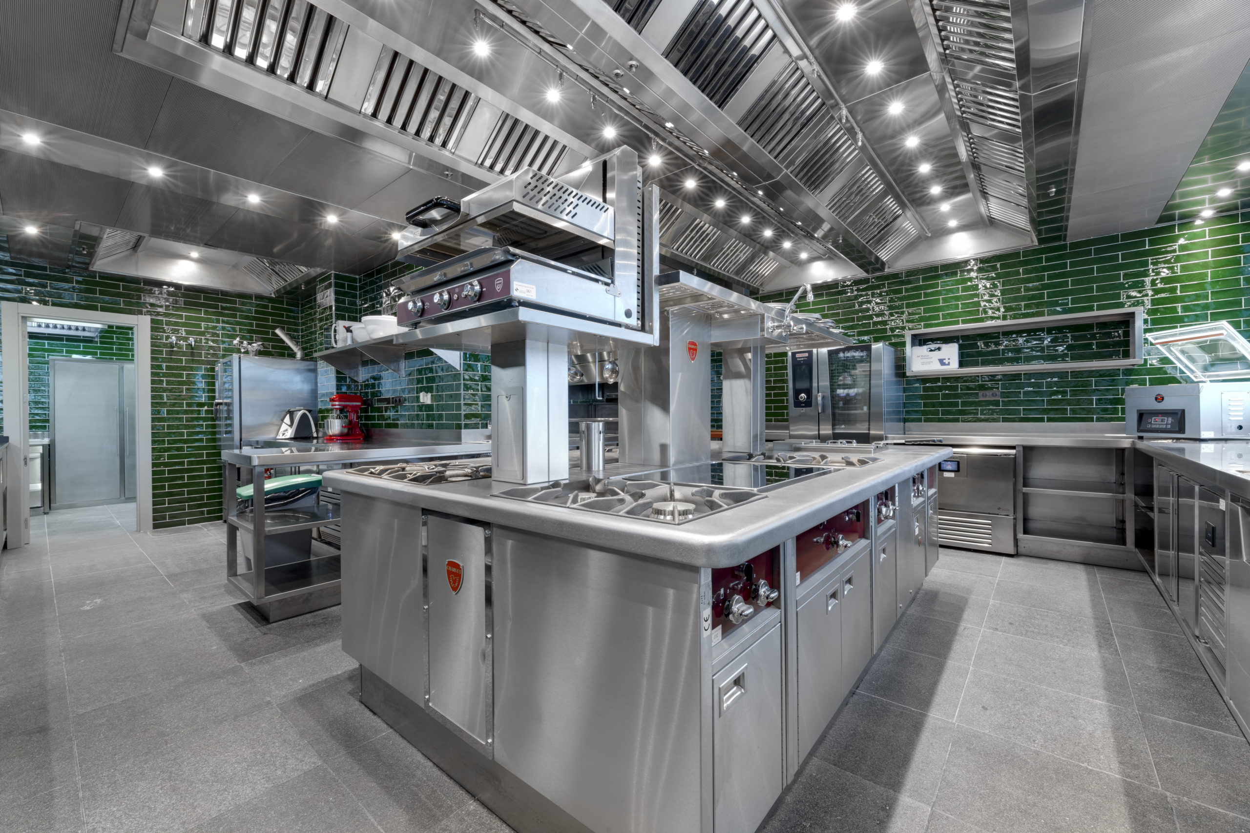 Una segunda cocina central Charvet de plano único y techo filtrante para restaurante de autor con cuarto frio de preparación y zona con túnel de lavado.