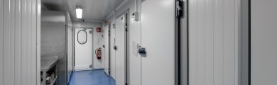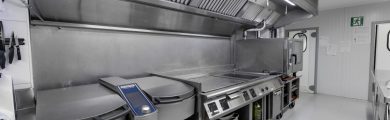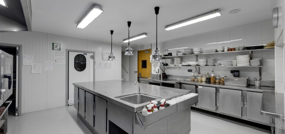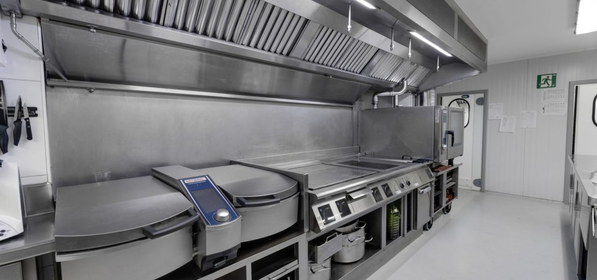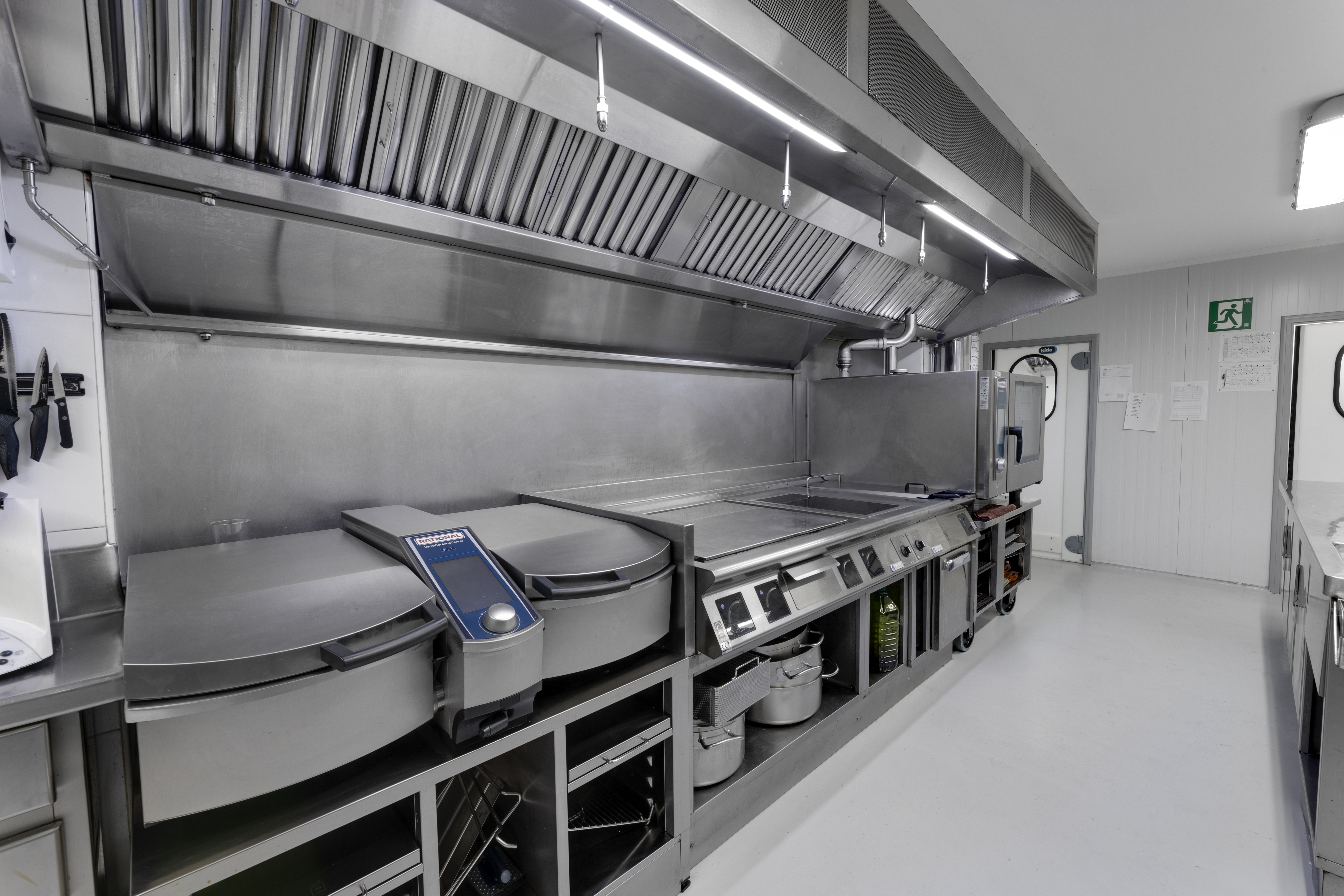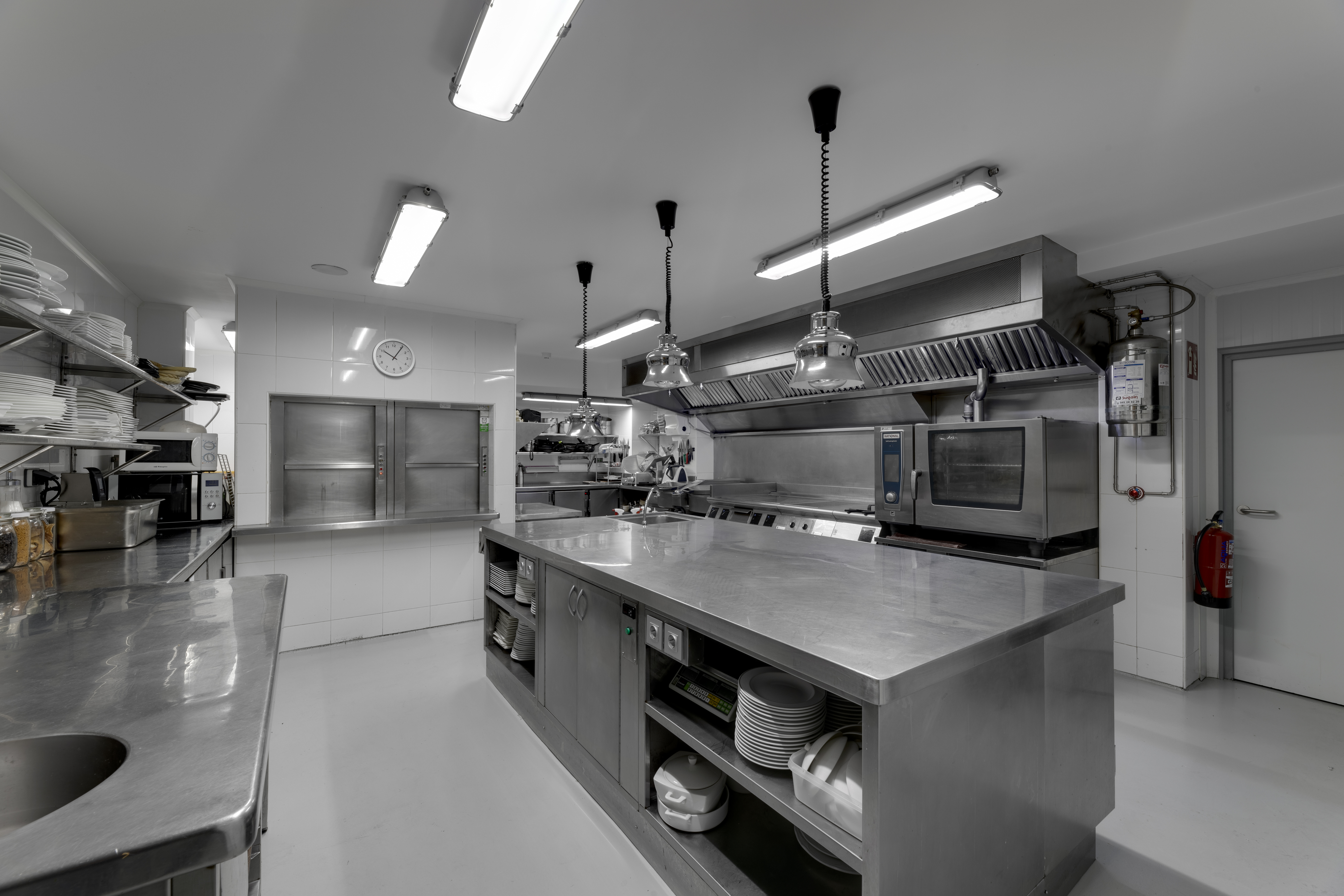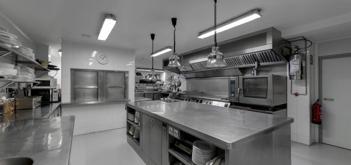 Situada en el sótano donde del Hotel se realizó la cocina pensando en el flujo de trabajo óptimo. Para ello se abrio una puerta de entrada a proveedores con 2 cámaras y congelador de panel, almacén seco, cuarto motores y cuarto limpieza.