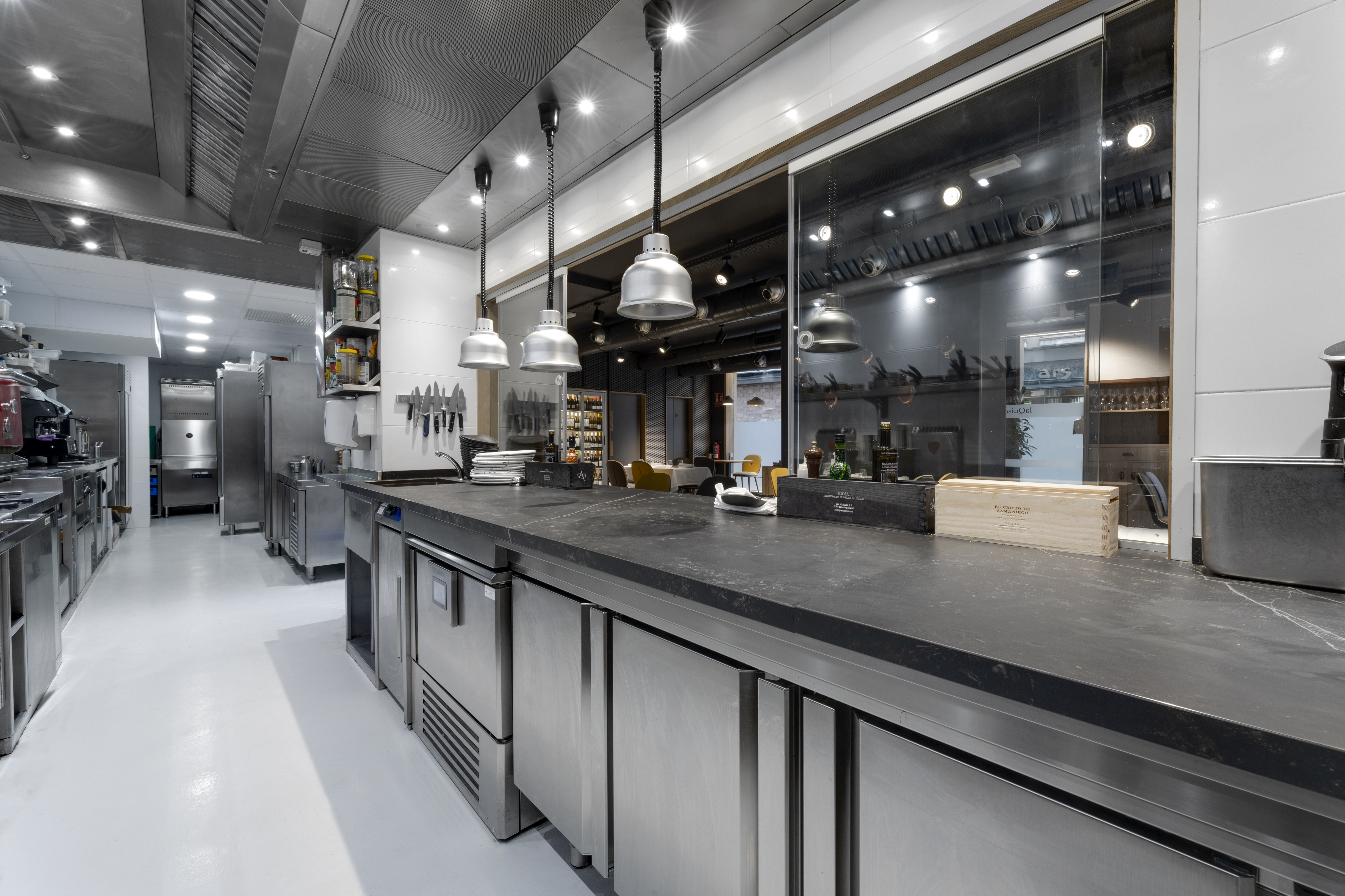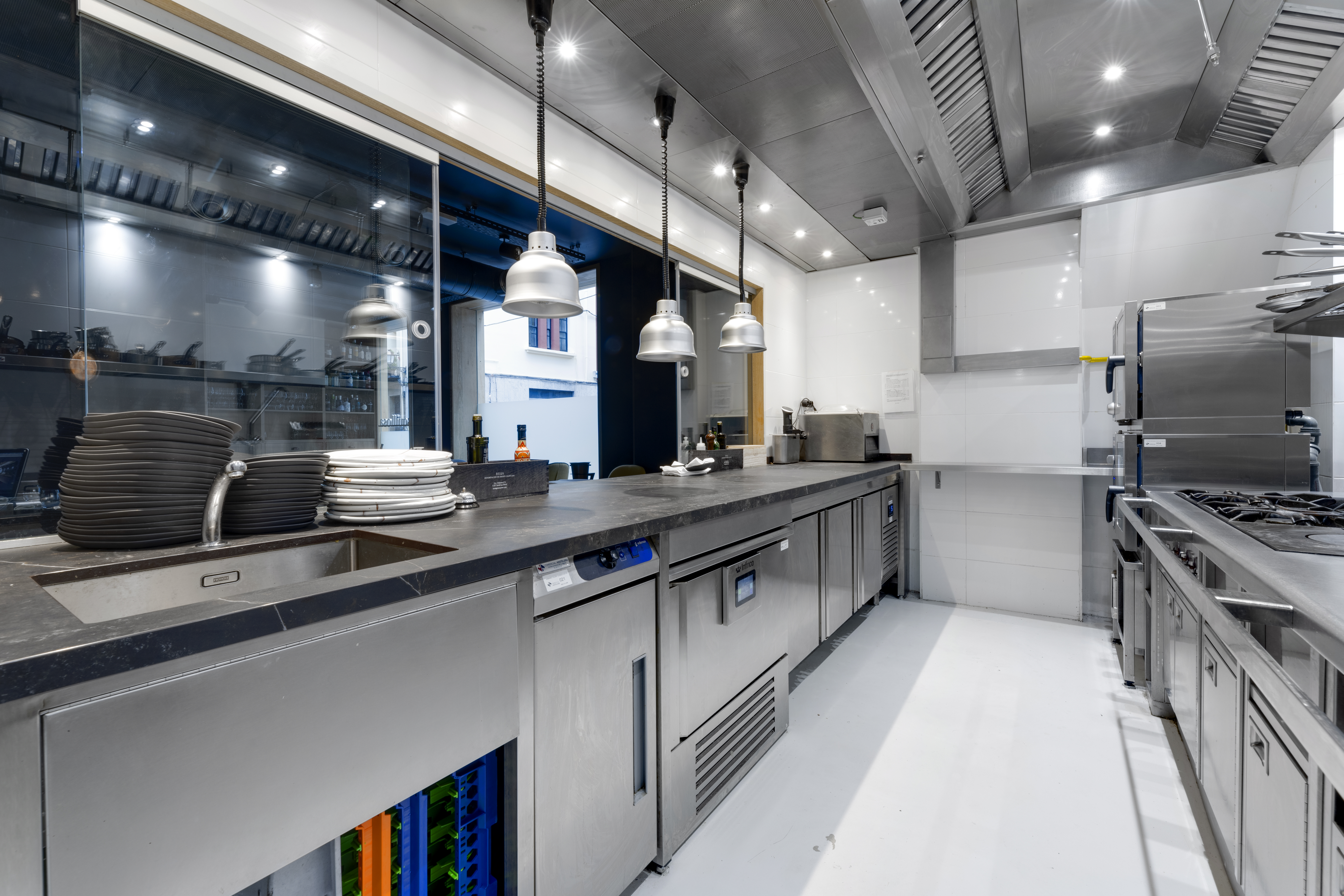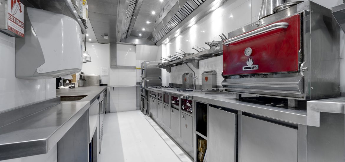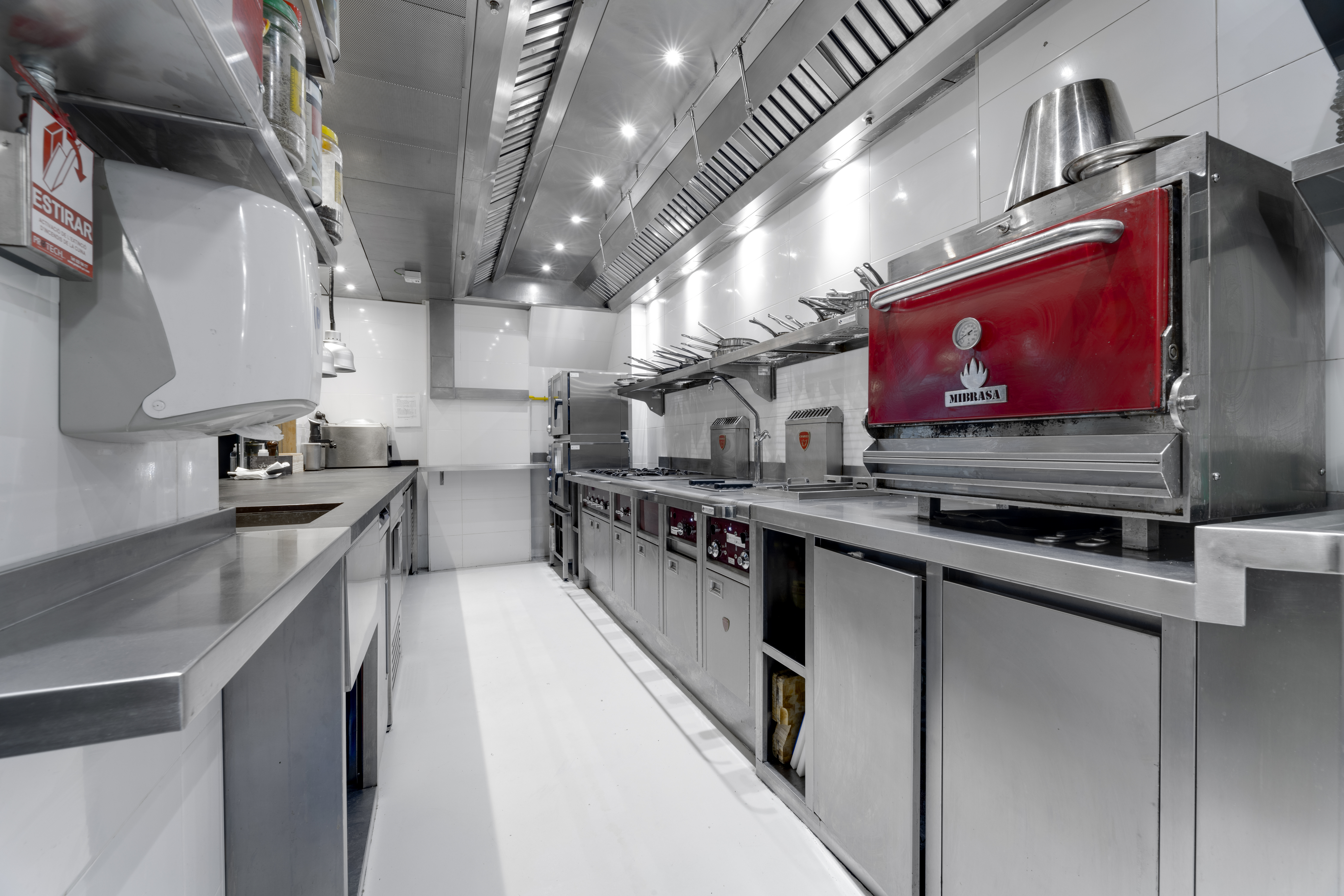 En su interior, se cuenta con una cocina Charvet con encimara única y techo filtrante, un combio duo de Rational de 2 hornos XS acordes al espacio disponible y horno Mibrasa. Lo acompaña una zona de preparación con cámara de frio y congelación, pescados con bajo-mostradores Infrico, y una zona de lavado con capota de Sammic y paracristales de Winterhalter con osmosis.