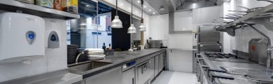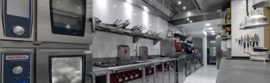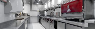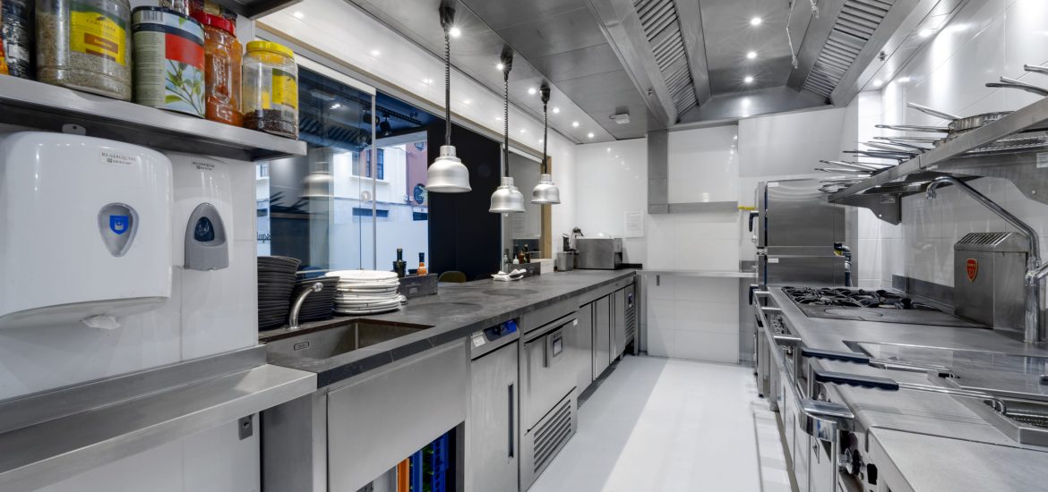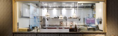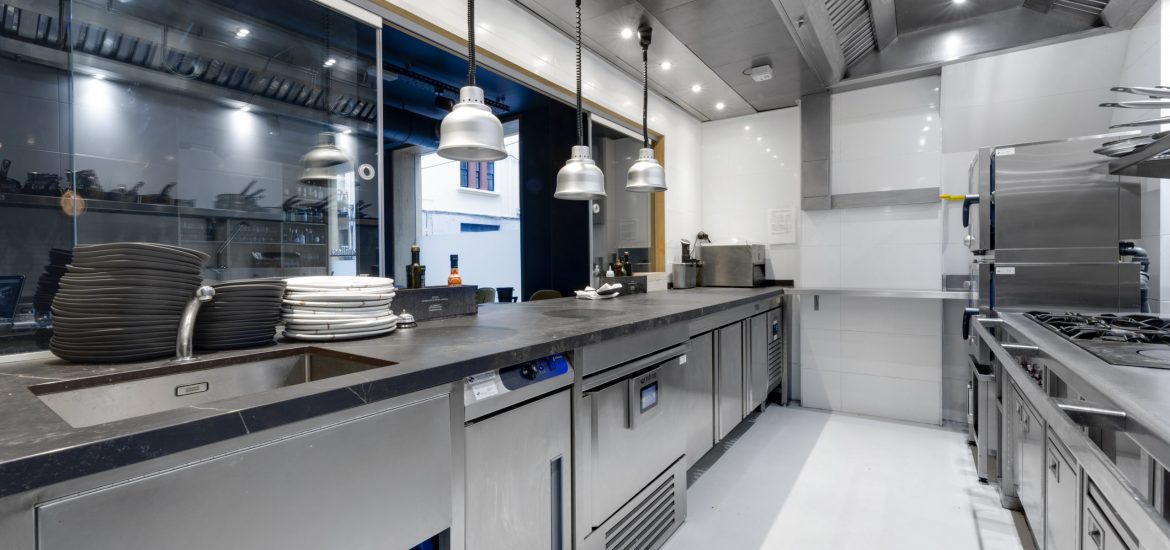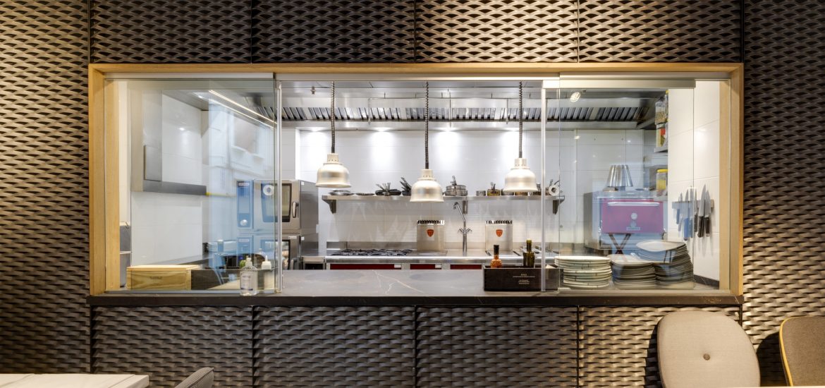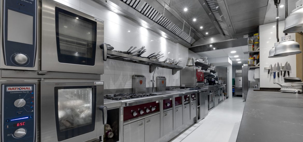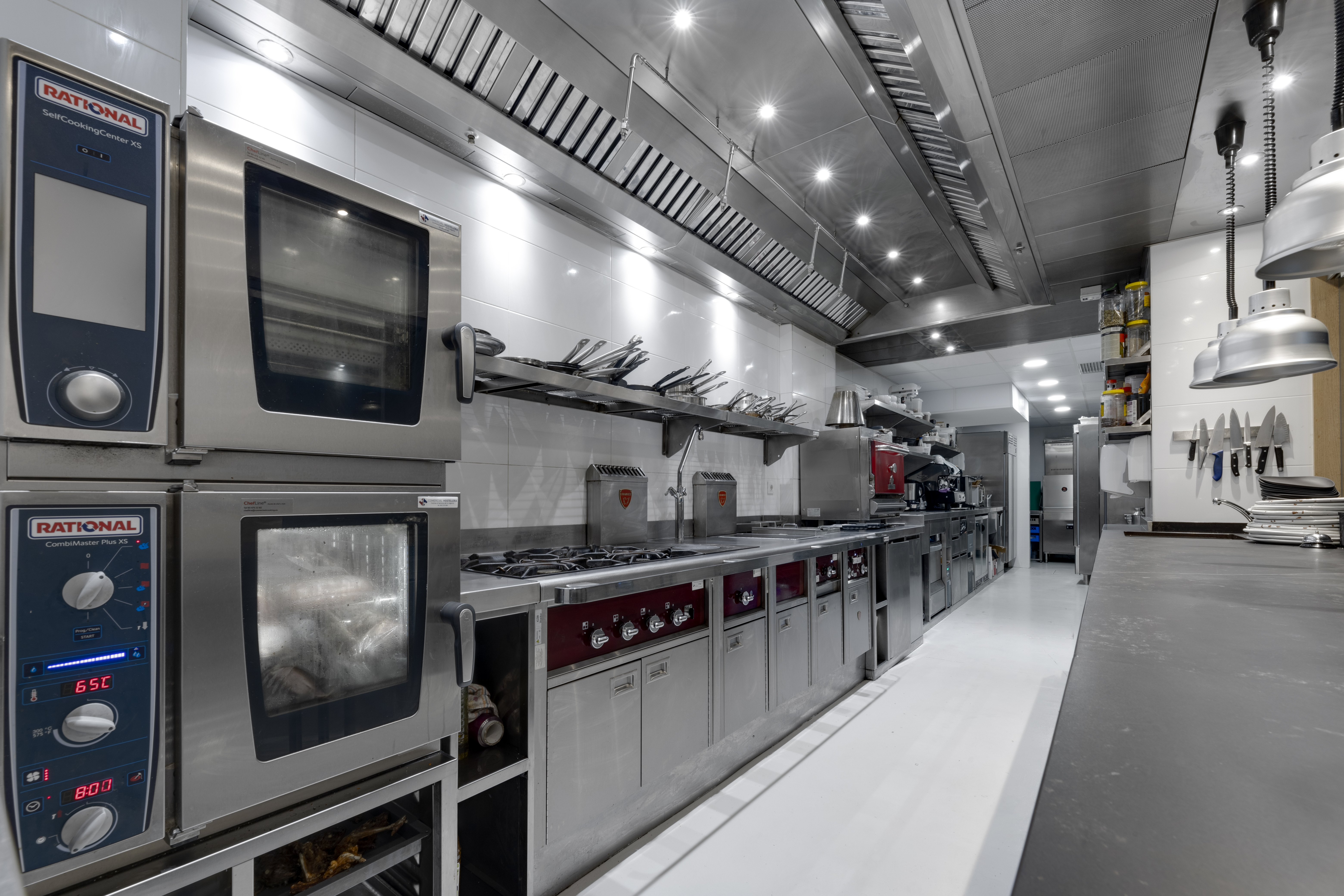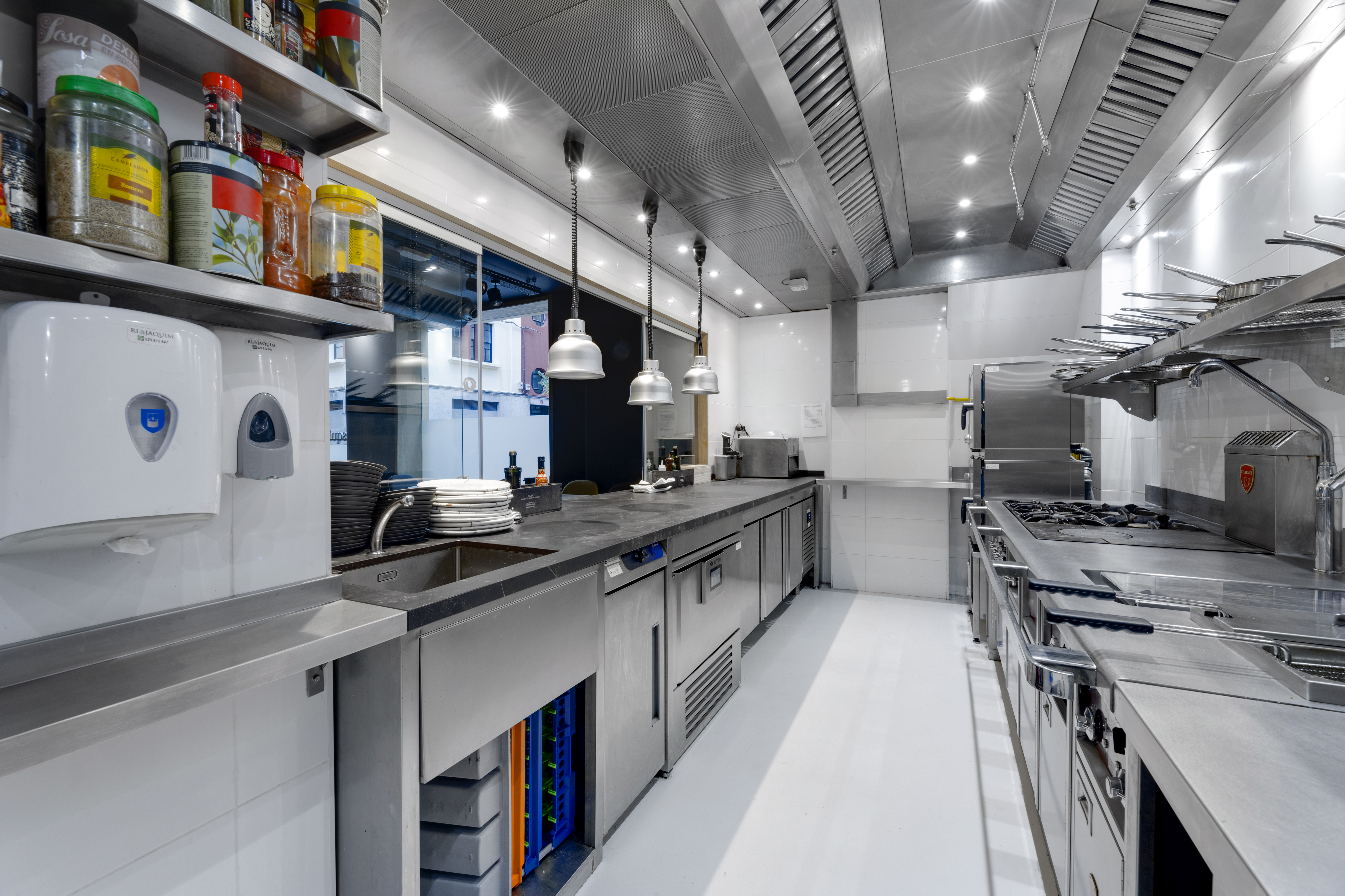 En su interior, se cuenta con una cocina Charvet con encimara única y techo filtrante, un combio duo de Rational de 2 hornos XS acordes al espacio disponible y horno Mibrasa. Lo acompaña una zona de preparación con cámara de frio y congelación, pescados con bajo-mostradores Infrico, y una zona de lavado con capota de Sammic y paracristales de Winterhalter con osmosis.