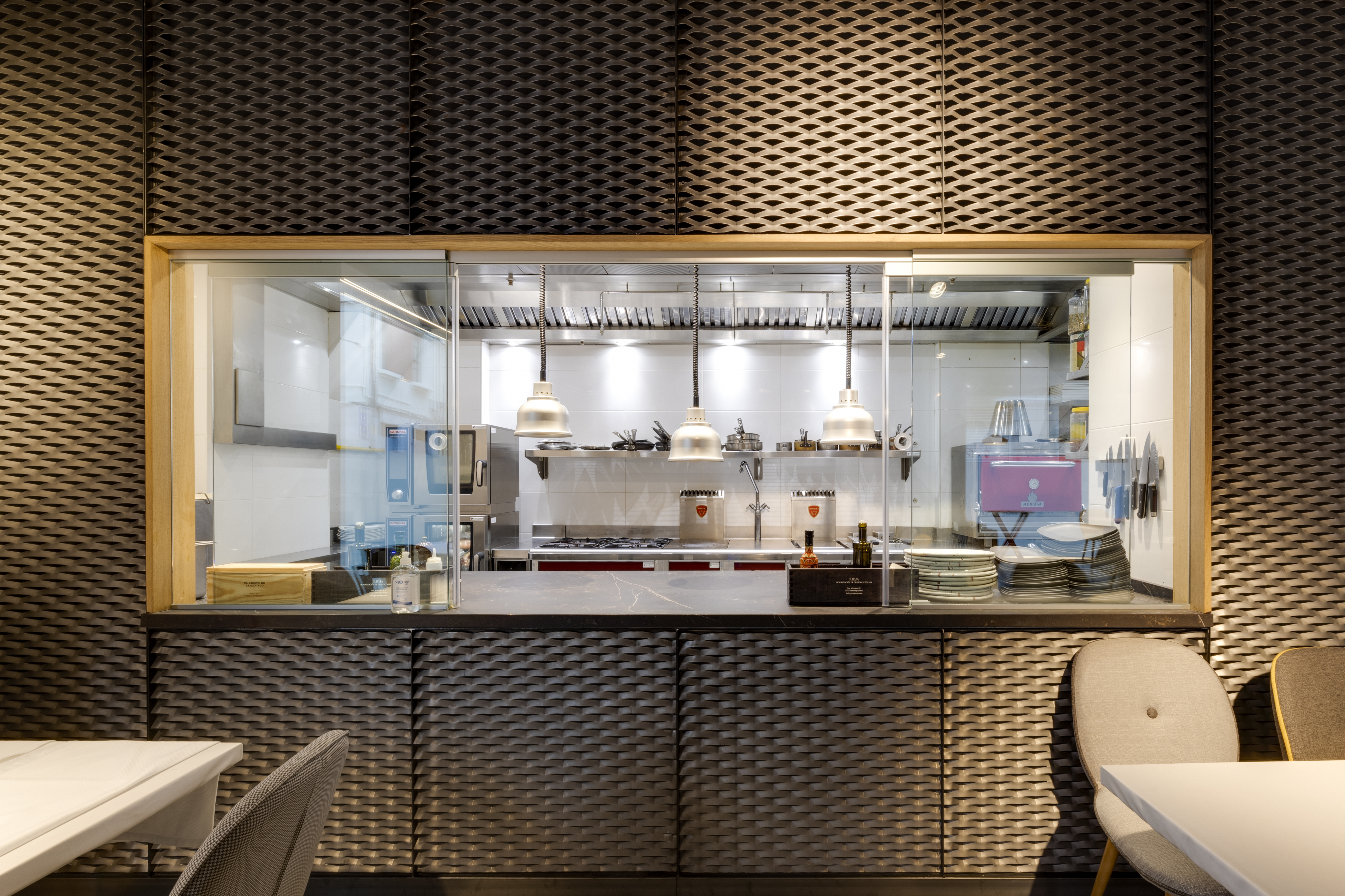 El proyecto cuenta con una cocina con una gran ventana que permite vislumbrar desde el comedor la cocina en directo.