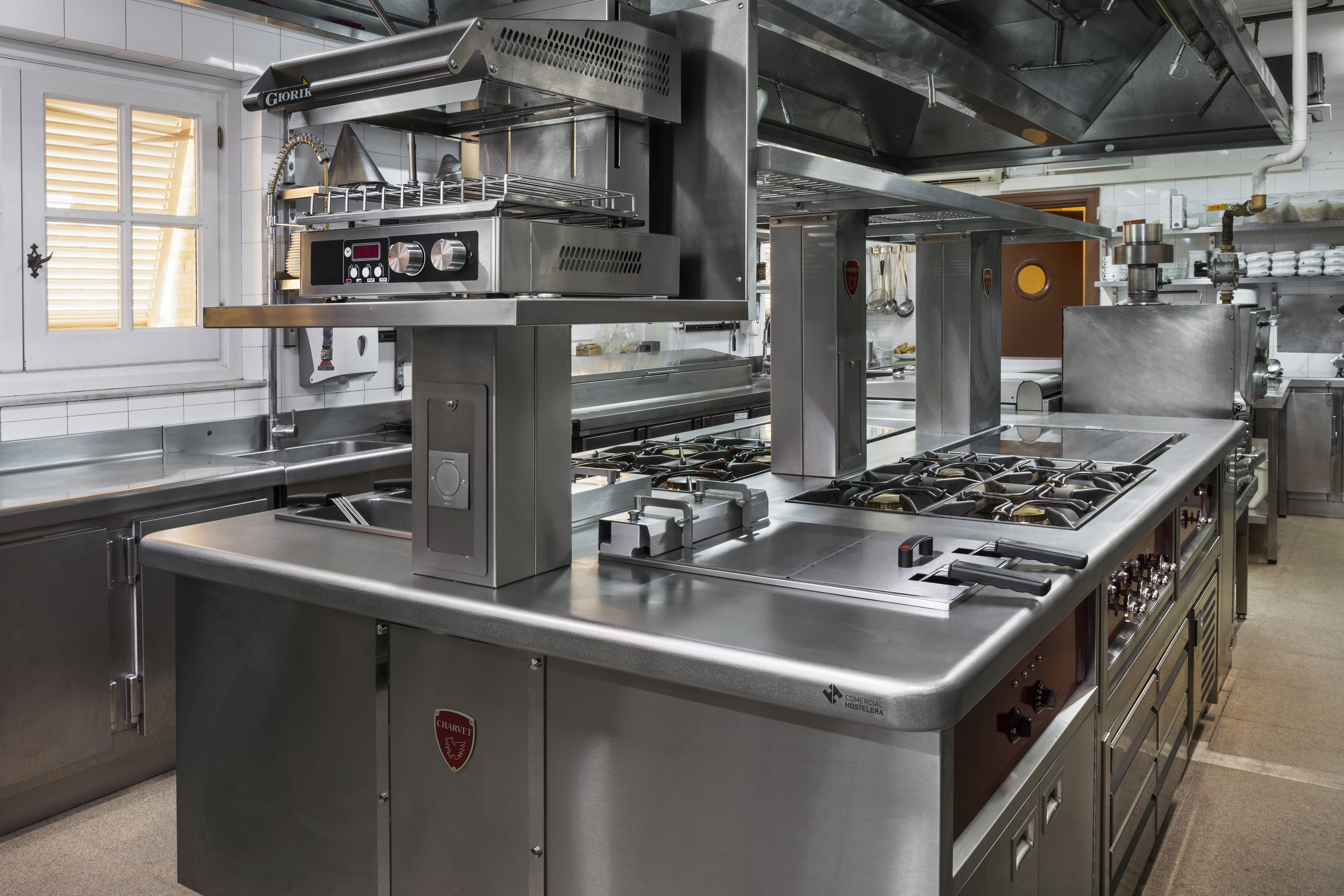 - Bloque de cocción central CHARVET con encimera de plano único, compuesto por dos frytops de cromo duro con balsa de agua y dos cocinas, también con balsa de agua, lo que facilita una limpieza eficiente y garantiza una mayor durabilidad de los equipos. El conjunto se complementa con freidoras VALENTINE de alta potencia encastradas, de 10+10 litros y 18 litros. En el centro del bloque, se ha integrado una parrilla de emplatado a medida con soporte para salamandra, ideal para el servicio de pase.