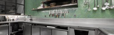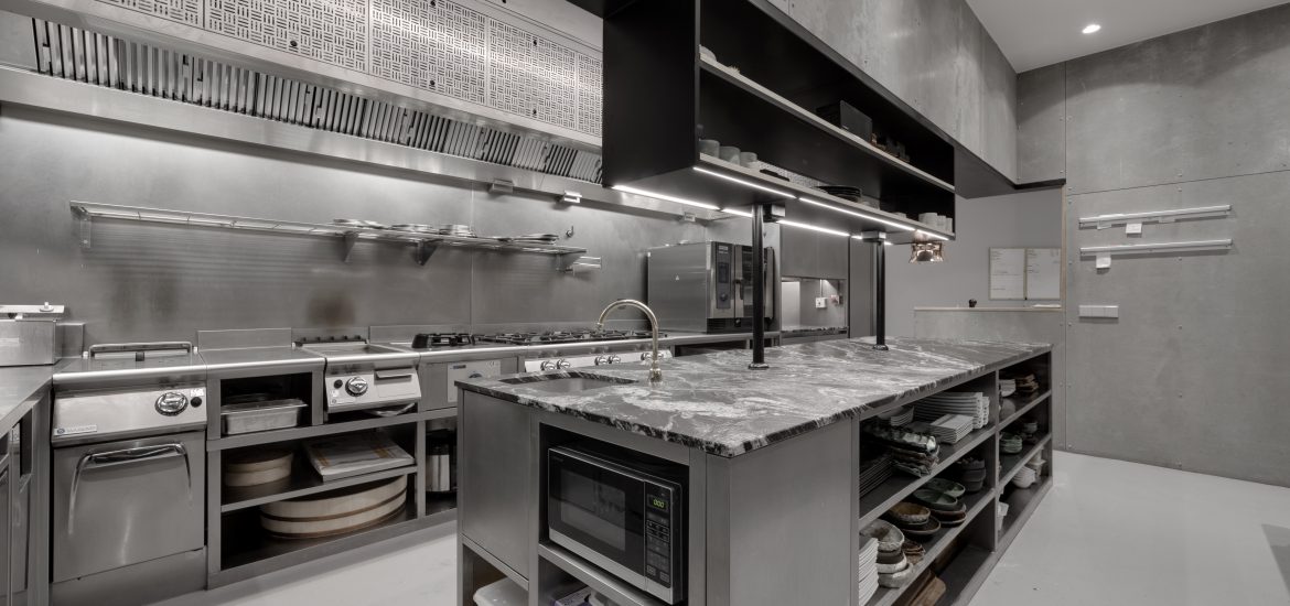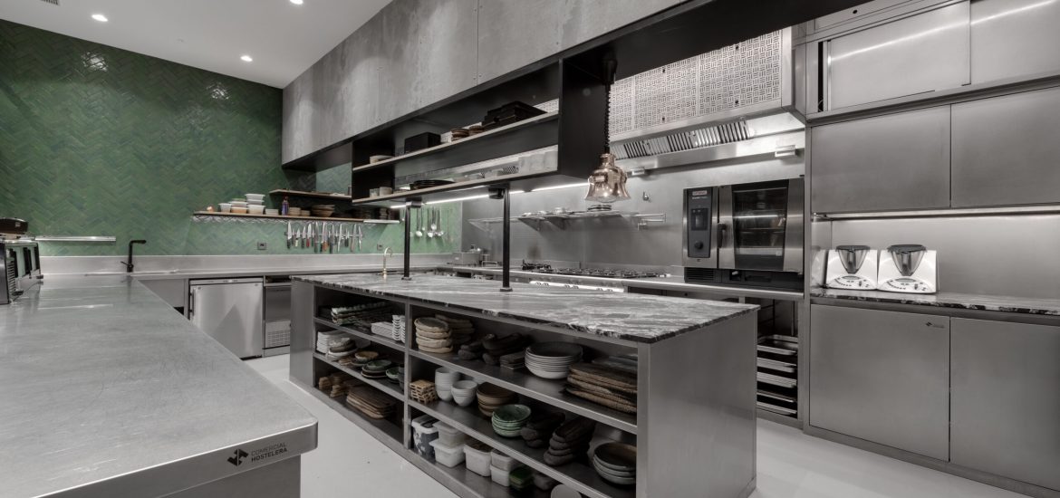 En el centro se sitúa una isla construida en acero inoxidable con encimera en piedra, con hueco para armario refrigerado para pescados y un bajo mostrador refrigerado, y el resto del mueble con baldas para vajilla y todos los bajos con zócalo perimetral.