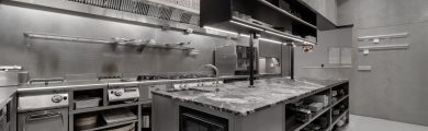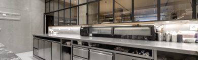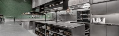 Restaurante Elosta, especialista en pescados y sushi, cuenta con una amplia cocina conformada por un bloque de cocción Mareno que incluye una cocina de 6 fuegos, una plancha con la placa de cocción en acabado de cromo duro, una freidora de gran capacidad de 23L, un horno Rational y un fuego para wok encastrado.