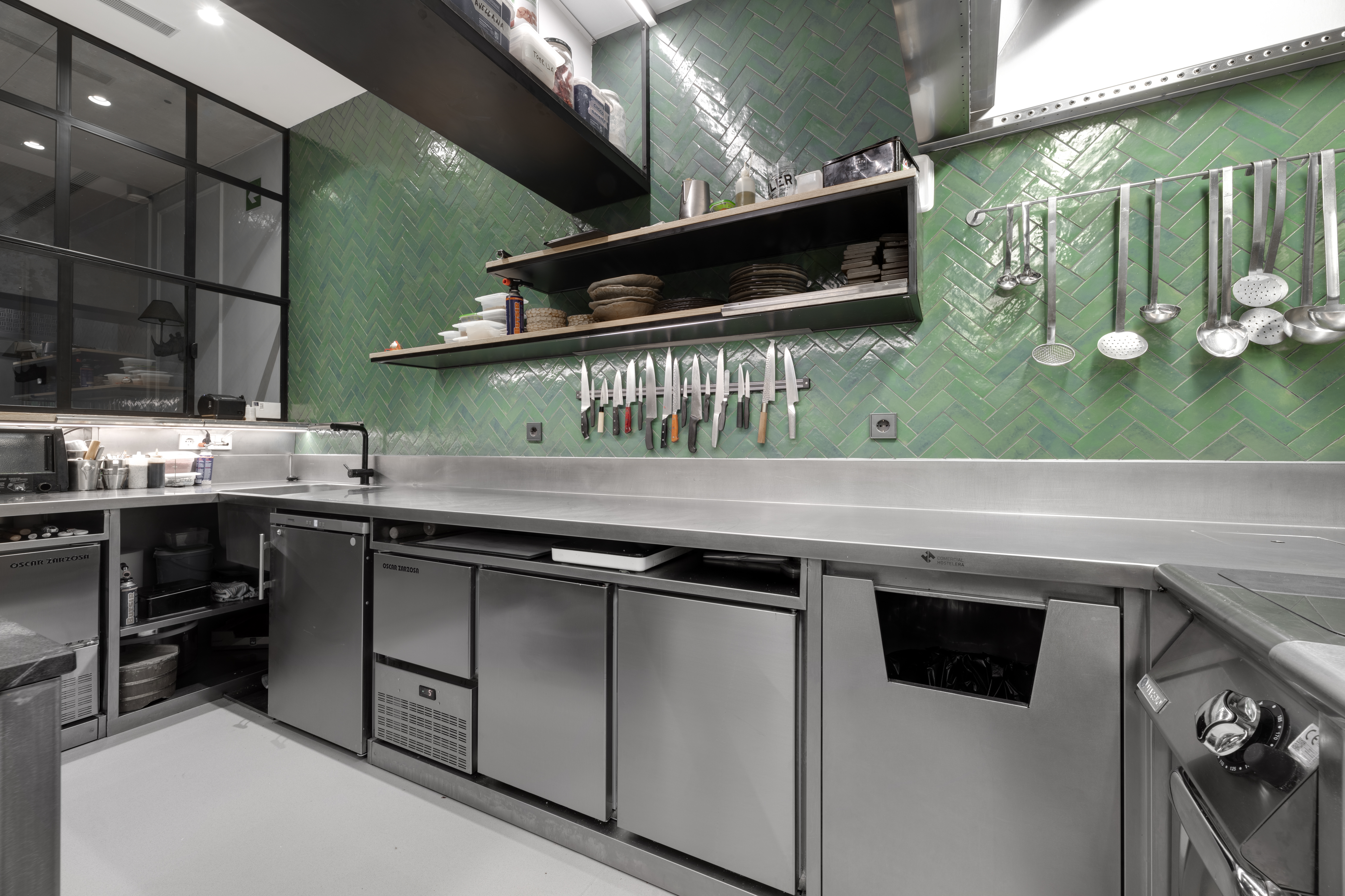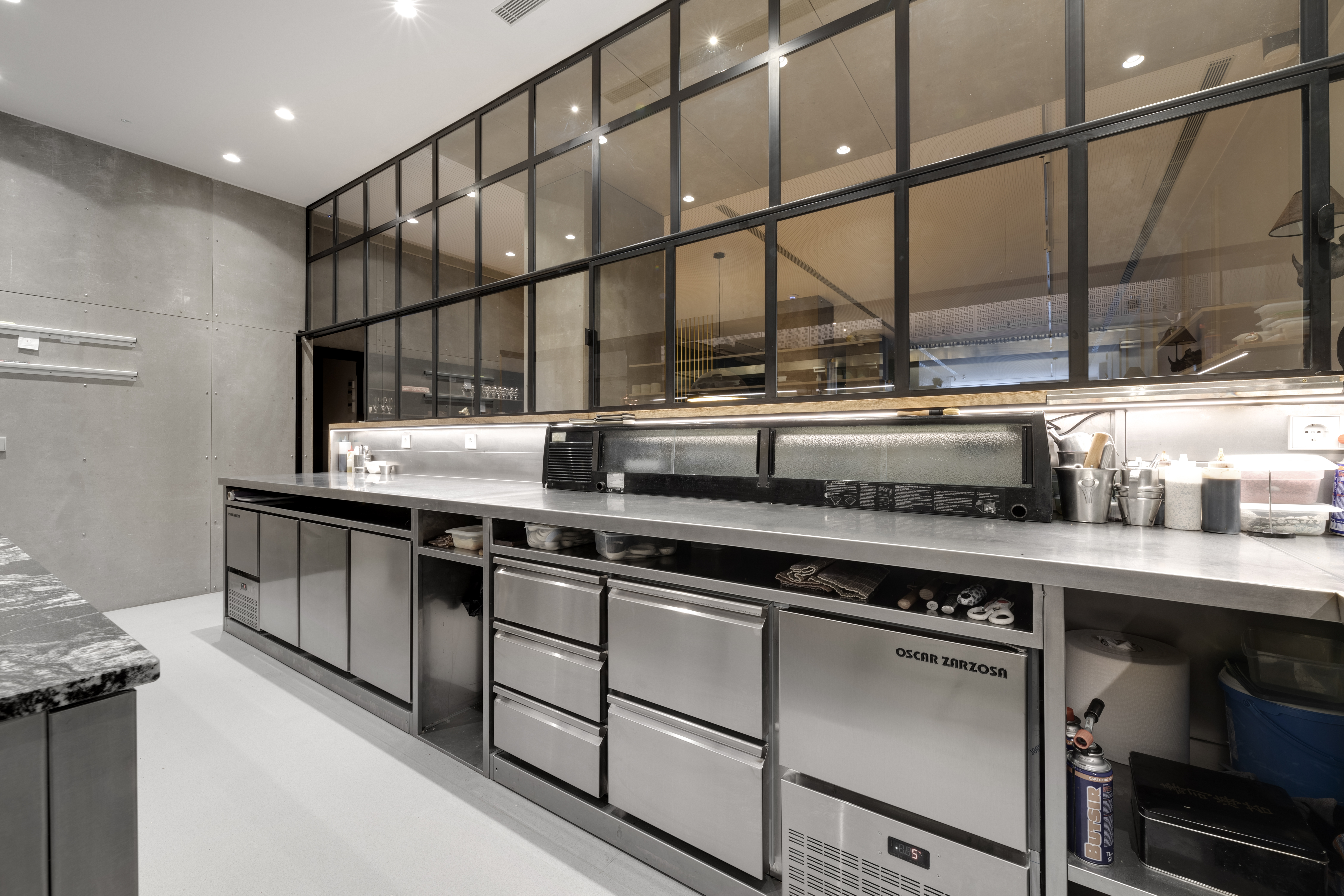 En la zona de lavado, una mesa de entrada y salida completa con su lavavajillas correspondiente, y, la zona de camareros cuenta con un mueble construido en acero inoxidable y encimera de piedra. Cuenta también con un hueco para bajo mostrador con puertas de cristal y armario para vinos.
